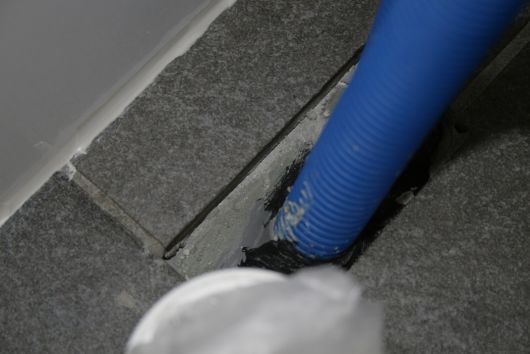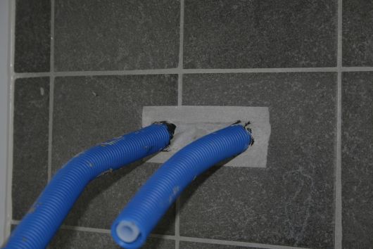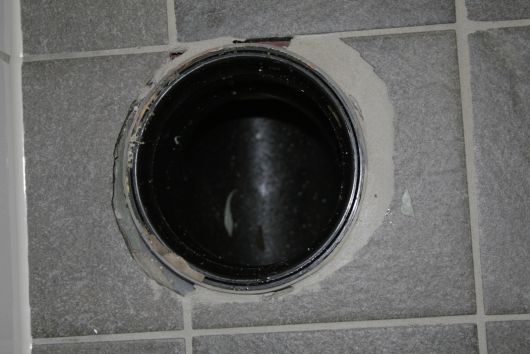 Flislegger har som nevnt før fullført gulvet på mitt nye bad. Når flislegger har lagt flisene har han selvsagt ikke lagt flisene helt inntil vannrørene og slukrørene.