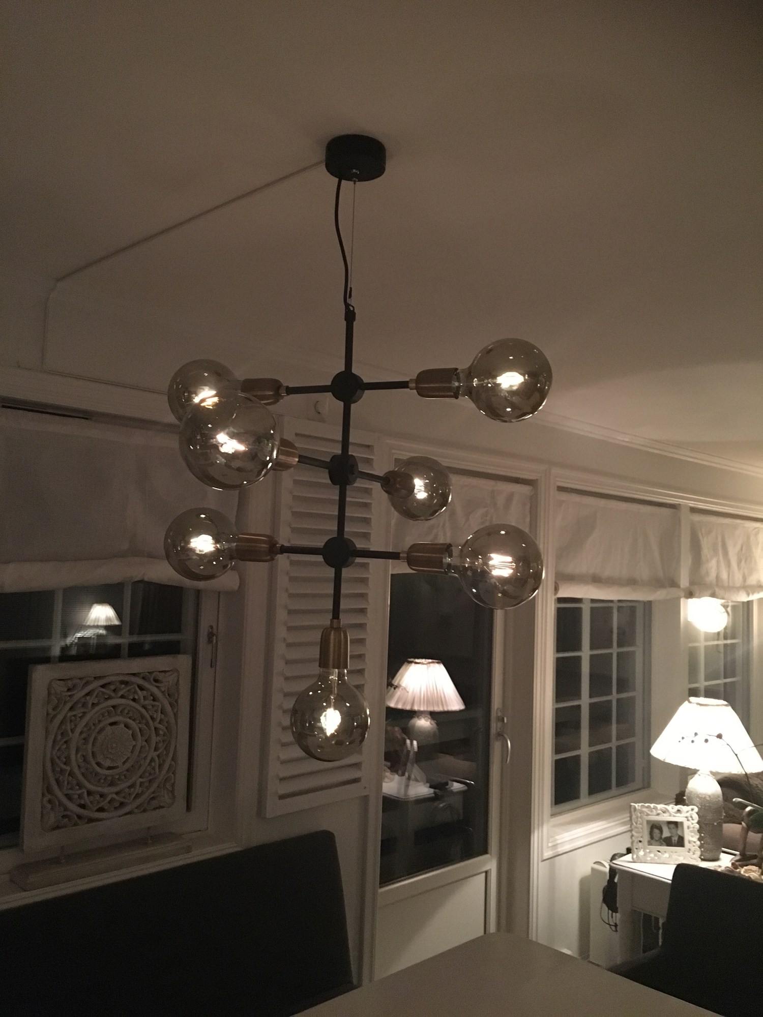 Når lampa har 7 pærer og jeg f eks monterer 4 watts dimmbare ø125mm pærer så er jeg innafor. MEN det blir umulig å dimme ned til kosebelysning.
