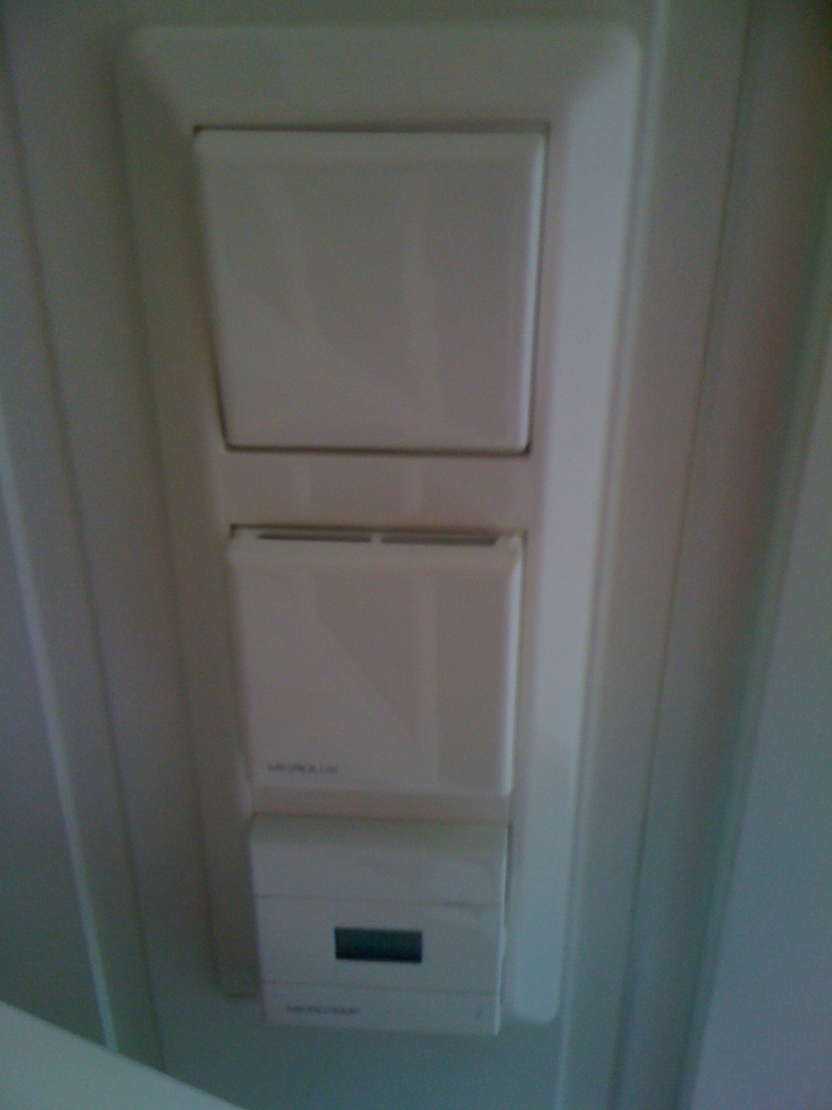 Denne bryteren har de koblet opp til utelyset (led downligts) bestilte dimmer, fikk først "vanlig" dimmer, men når de var ferdige emd boligen hadde de skiftet ut til denne typen, trodde det var dimmer, men det virker ikke helt slik, for av på knapp den er jo ok, ved siden av er det en liten sort rund knapp, når jeg tryker på den går lyset også av men det skjer liksom ikke noe om man holder den forsiktig inne….