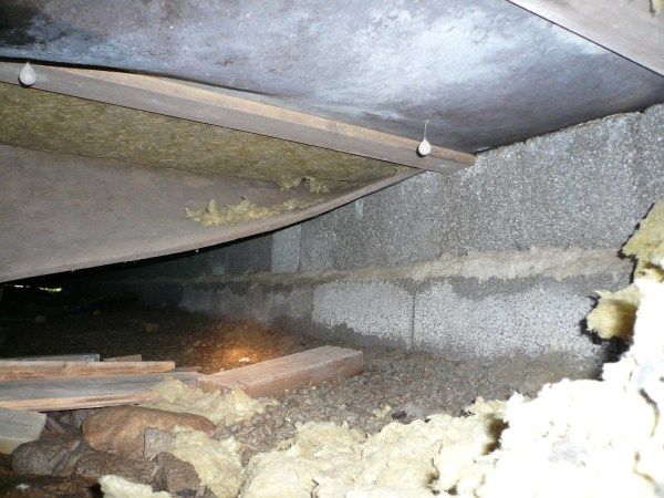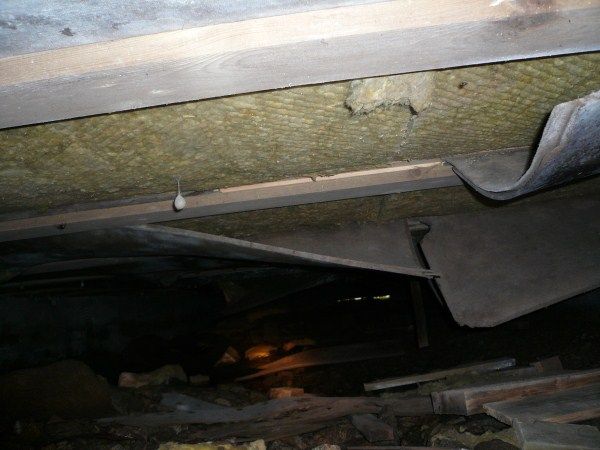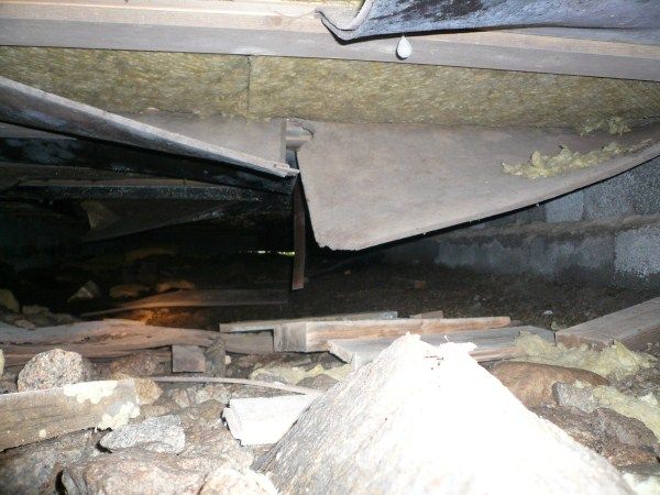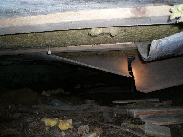 Jeg var redd muggen var kommet tilbake under gulvet og åpnet (se vedlagte bilder), men der var det ikke noe mugg. Under soverommet er det lagt glava og noe som ligner asfaltplater. Noen av de platene har sunket eller falt ned. Det er en liten dam der.