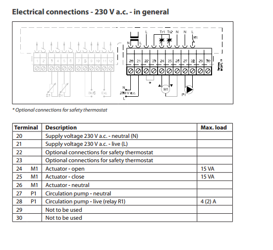 Varmesystemet er vann til radiatorer fra en kombielkjel, hvor "contoller" i systemet er en Danfos ECL 110. Vedlagt er et enkelt el-koblingsskjema. Jeg ser nå at elektrikeren bare har "routed" sirkulasjonspumpen min rett igjennom via pins 20 og 21 (pluss en bryter på ledningen, jf slå av pumpa om sommeren) - den burde kanskje heller vært på pin 27 og 28 i skjemaet, jeg antar de to pins vil "flow normal AC current" når sirkulasjonsventil er åpen (se under) og lukker kretsen når ventilen lukkes. Jeg kan sjekke det først med en lyspære.