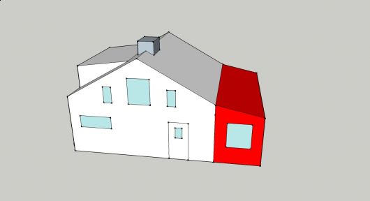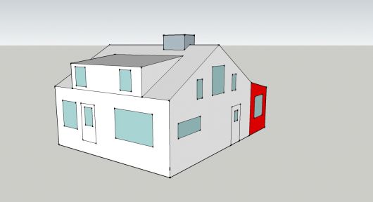Jeg ønsker ikke å legge ut bilder, og jeg tror ikke bildene ville sagt så mye, men er ganske "straight forward" hus. Laget i full fart noen enkle sketchupbilder av det. Det i rødt er tenkt som et påbygg med bad/vaskerom.