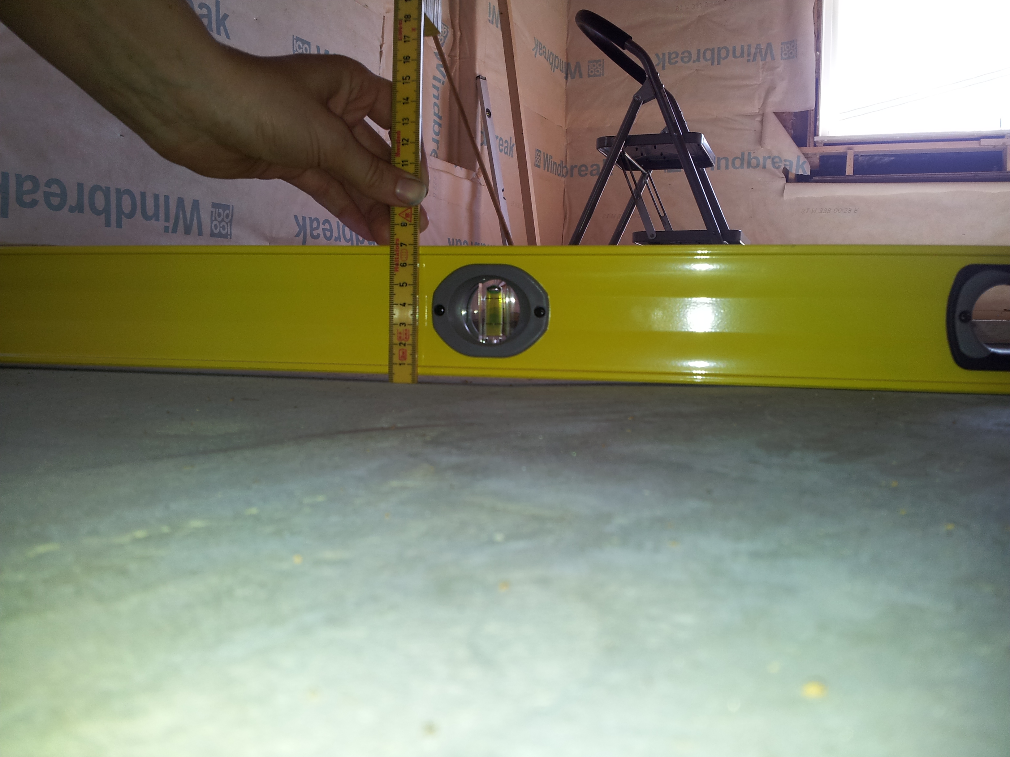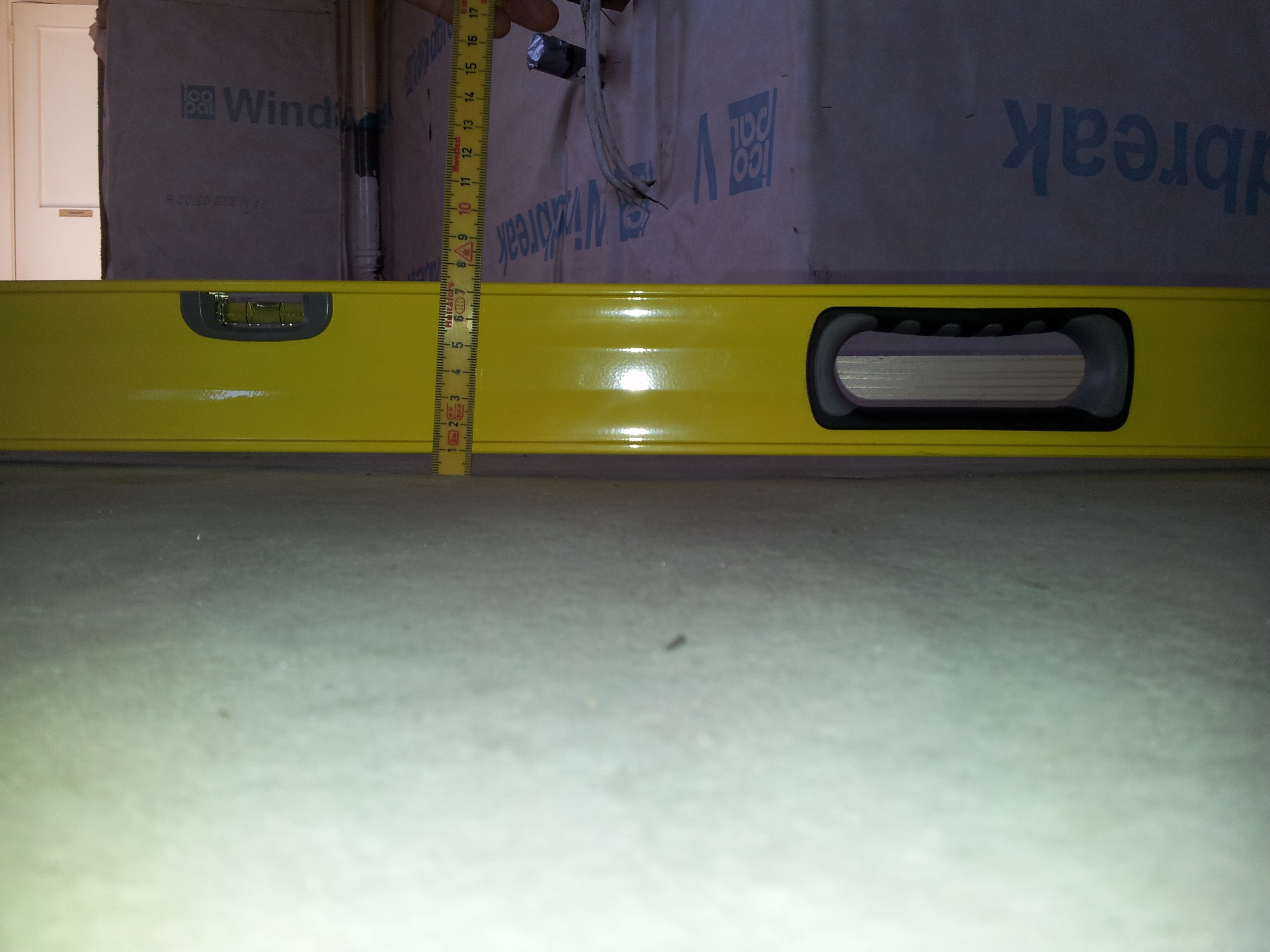 Vi har fått flytesparklet kjøkken og stue, ca 40 m2. Men vi synes ikke resultatet ble så rett som forventet. Et sted er det ca 1 cm dump og et annet sted en halv cm forhøyning.  Forhøyningen er der arbeideren reiste ut for å kjøpe mer materialer og den ene delen tørket noe før resten ble lagt.