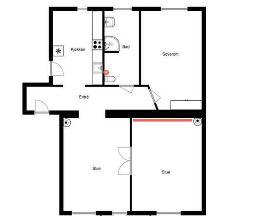 Vurderer å flytte eksisterende kjøkken ut i den ene stuen(Rød linje). Etasjeskiller av trebjelkelag, så jeg håper at det kan være mulig å legge 75mm avløpsrør i gulv med tilstrekkelig fall. Soil-røret finnes inne på eksisterende bad(rød sirkel). Den veggen hvor jeg har sett for meg å ha nytt kjøkken er en bærendevegg, noe jeg kan se for meg vanligvis gjør ting veldig mye mer komplisert? - men det har tidligere vært to dører i veggen - som idag er tettet igjen. Disse to dørene finnes på hver sin side av døren inn til soverommet. Altså den ene døren er så og si vis-à-vis inngangen til badet.