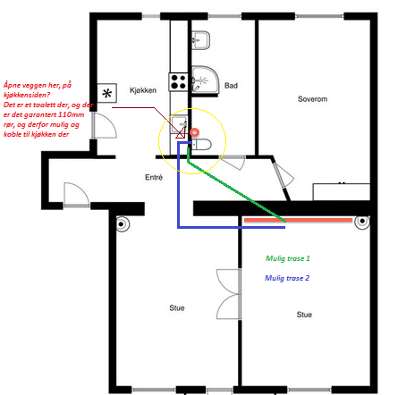 Jepp, tanken slo meg etter at jeg postet innlegget - og burde være en høyaktuell løsning på problemet om det finnes tiltrekkelig fall på lengden:) og takk for god skisse, alt_er_mulig!! Men om man skulle bestemme seg for å bare ta hele røkla i en omgang(bad og flytting av kjøkken), vil dere fraråde å gå inn som "prosjektleder" på en slik jobb med nevnt omfang når man ikke har mye erfaring på området? og heller bare sette vekk hele jobben til en evt. entreprenør. Kan se for meg at en eventuell vinningen går fort opp i spinningen om man ikke kan vise til en del erfaring på området?