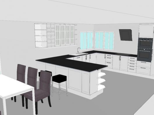 Platetopp og ventilator skal være 80 cm, ikke 60 cm som på bildet. På enden av øya skal de åpne hyllene ut mot spisestuen, men dette får jeg ikke til i homeplanner fordi jeg har satt sammen øya av 60 cm benkskap på ene siden og 37 cm på den andre. Skapet med de åpne hyllene er 60 cm dypt, og går kun an å plassere på samme side som de andre 60 cm dype skapene. Men i praksis vil det jo fungere!