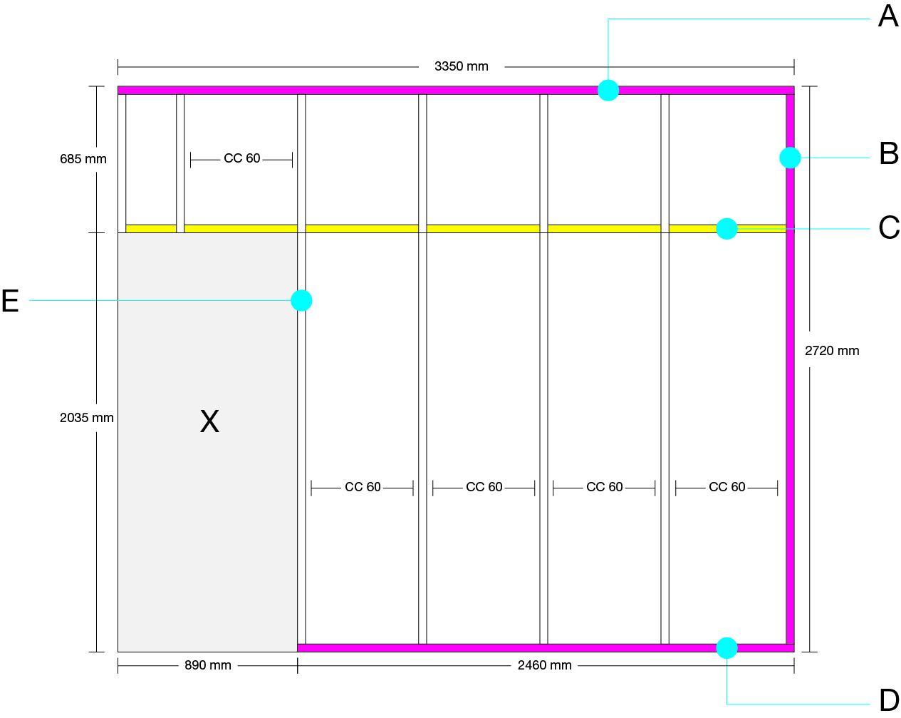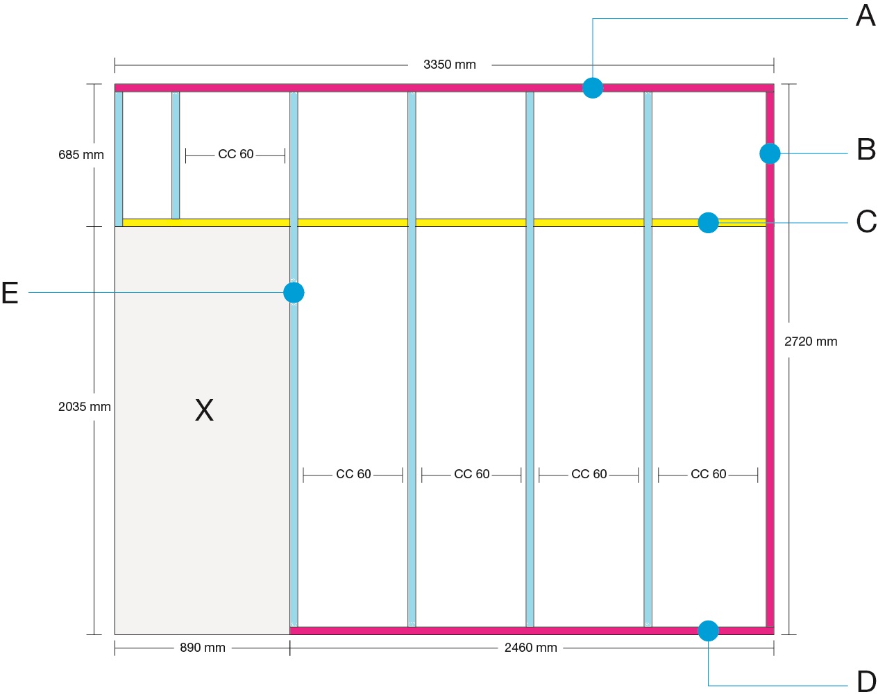 Merk at det ikke skal gå en stender ned på den ene veggen, altså skal døren gå helt inn til veggen når den er igjen. Kan også nevne at vi bor i en gammel leilighet med ganske porøse murvegger, som ikke er helt optimale å borre i.