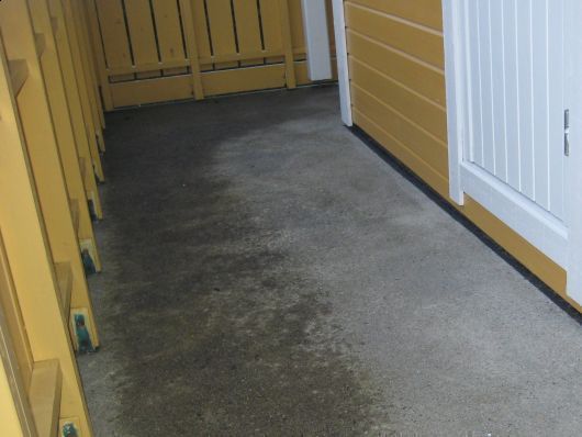 For å få dette tett ble det saget eit spor i betongplata og så beslag fra undersida av kledning og ned i sporet, deretter sort fugemasse (se bilde). Plata har ikkje fall.