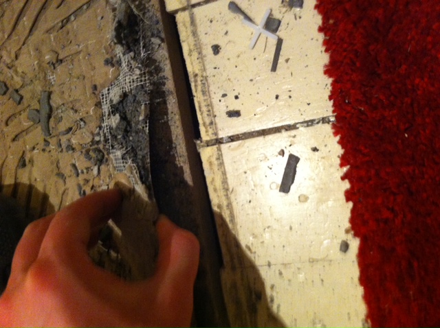 Underlaget nå er først flislim, deretter en slags matte som ser ut som om den er fyllt med knust grus, denne matten er igjen limt til treplater.