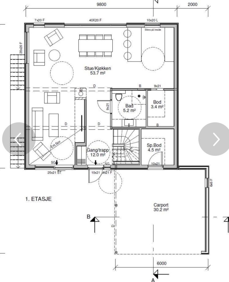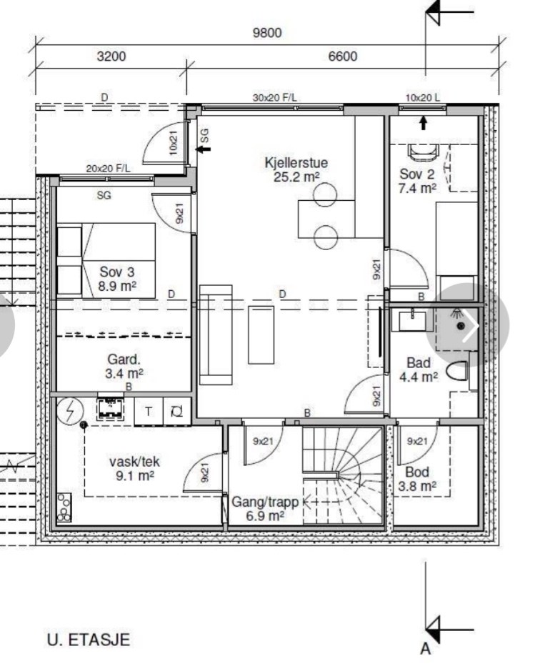 Se vedlagte bilder av planløsning. Endringer vi ønsker så langt er å utvide takterrassen slik at utgang blir fra loftstue/gang. Da får vi også overbygg over inngangsparti. Vi vil også rive veggen mellom bod og sportsbod og lage biinngang/grovkjøkken. Kjeller blir utleiedel, med unntak av vaskerom.