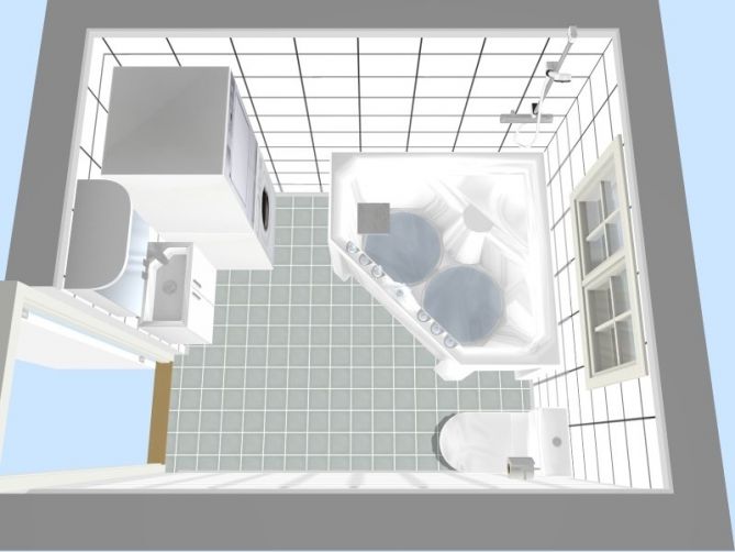 Lag en enkel pappmodell av hjørenbadekaret. (Ev sett det i et annet hjørne for vasken din kommer vel i veien nå. Se om det er greit med et stort kar.
