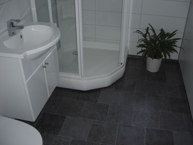 Du har det ikke like trangt, men vurder likevel å dusje på gulvet med glassdører. Husk å senke dusjområdet ca 10-15mm for bedre kontroll på vannet.