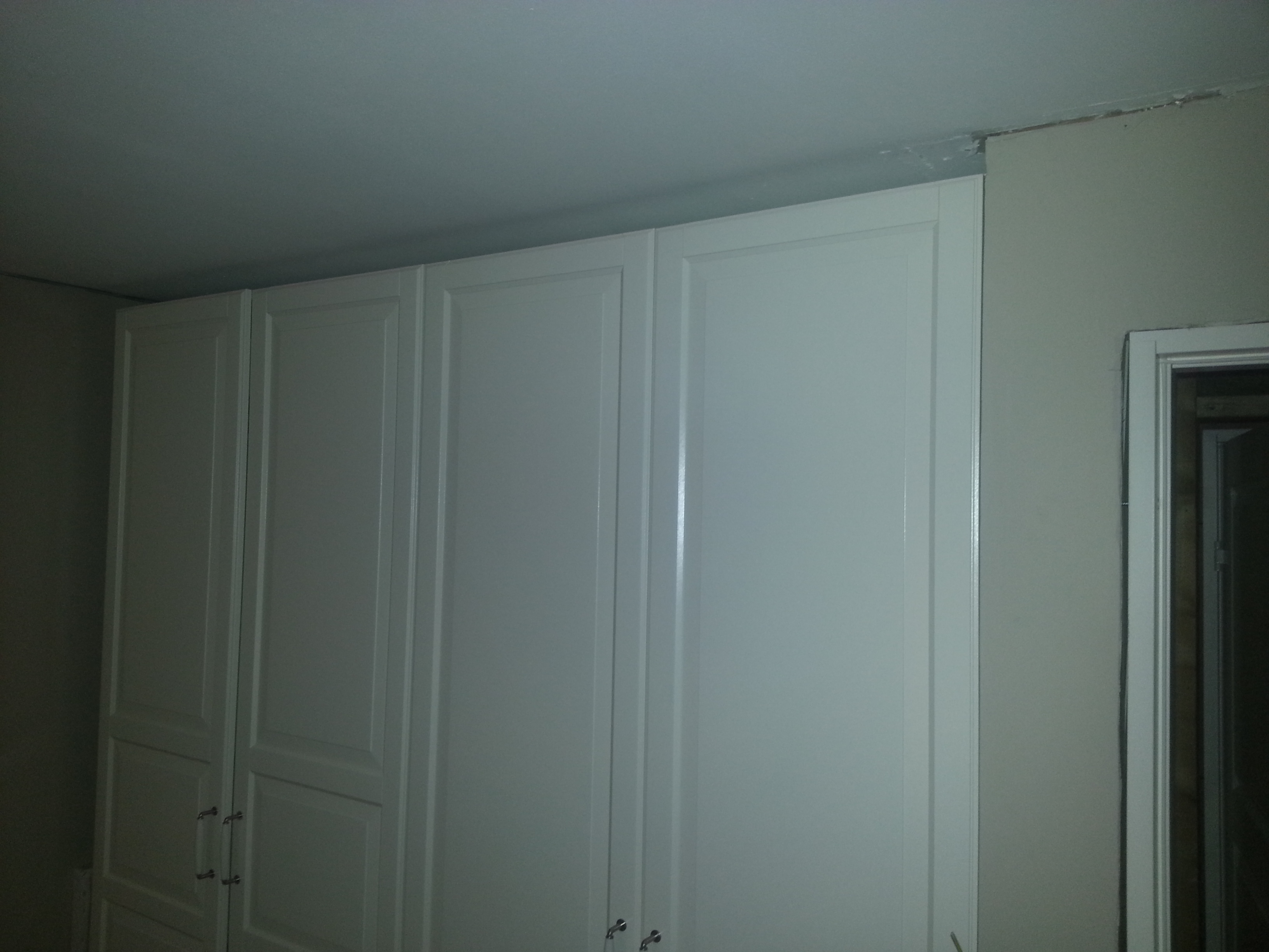 Vi har laget et lite rom for skap på soverom der skapet passer akkurat (sånn høvelig). Vi skal nå liste taket og grenger tips til hvordan vi burde gjøre det der skapet er. Det lille rommet er 60 cm dypt og hele skapet inkl dører passer inn der. Skal vi ha samme list over skap der skapet er skøvet helt inn, må vi lage et bittelite hjørne på en cm (somer dørtykkelsen) slik at listen flukter med stammen. Ellers må vi dra skapet ut slik at stammen flukter med veggen før listing gjøres. Da stikker dørene utenfor veggen. Hva er mest vanlig i slike situasjoner? Kanskje ta en helt egen flat list over skapet og ikke bruke samme som taklisten?