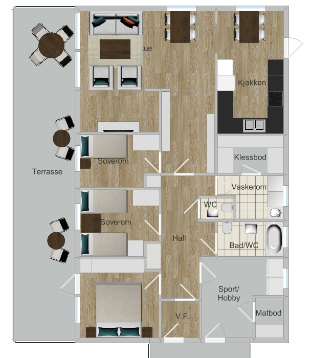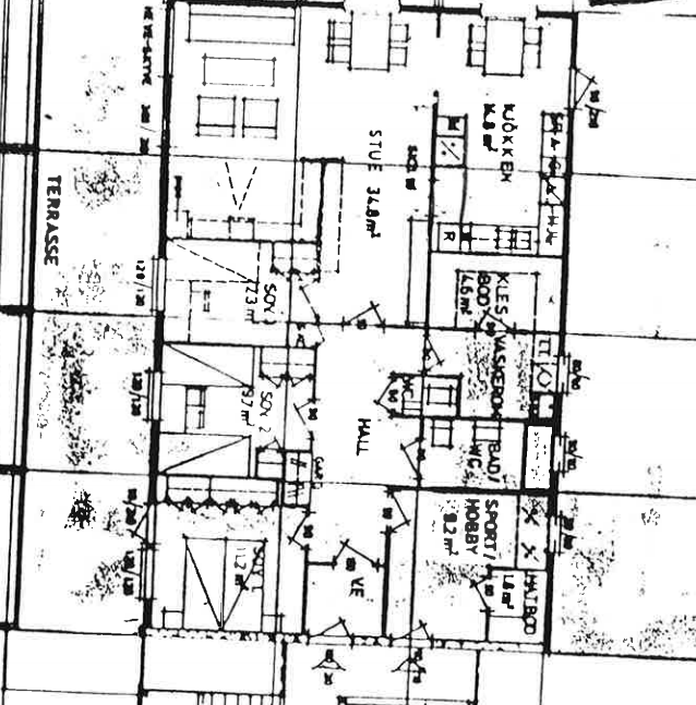 Har også vedlagt original plantegning fra 1983, samt en grov skisse fra Roomsketcher av dagens plantegning, samt hvordan vi ønsker å få det til.