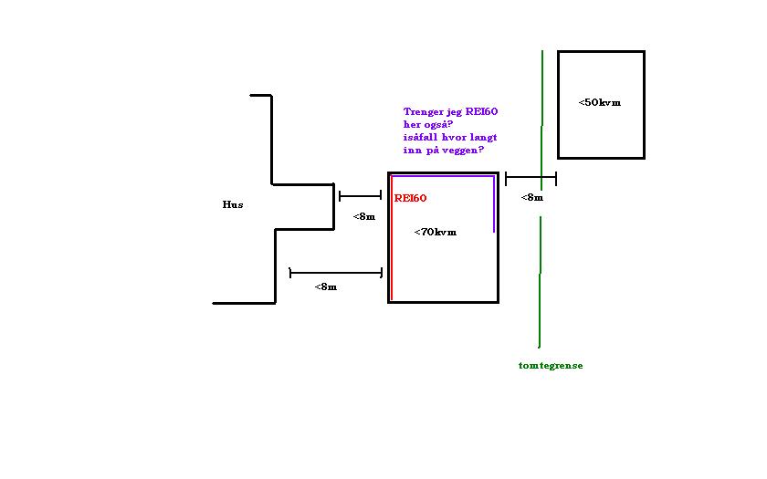Hvis dere ser på vedlagt tegning ser dere at mitt eget hus kommer til å ligge nærmere enn 8m noe som gir krav om REI60 på vegg og deler av taket om jeg har forstått det riktig.