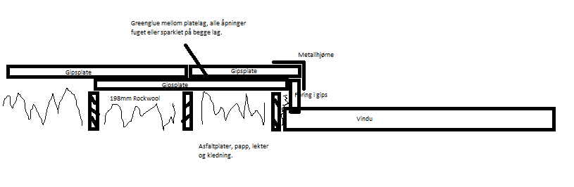 Hadde forøvrig en arkitekt innom nettopp, og han sier de ofte benyttet to lag vannfast gips på utsiden, under kledningen, i støyutsatte bygg. Det var visst nok svært effektivt. Kan tro på det, ettersom lyddempingen alltid er mest effektiv på støysiden. Men for meg som vil ta det i steg for steg på eksisterende bygg, og heller ikke ta hele bygget, så blir det for mye jobb å bygge ut deler av vegg. På nybygg derimot er det jo enkelt.