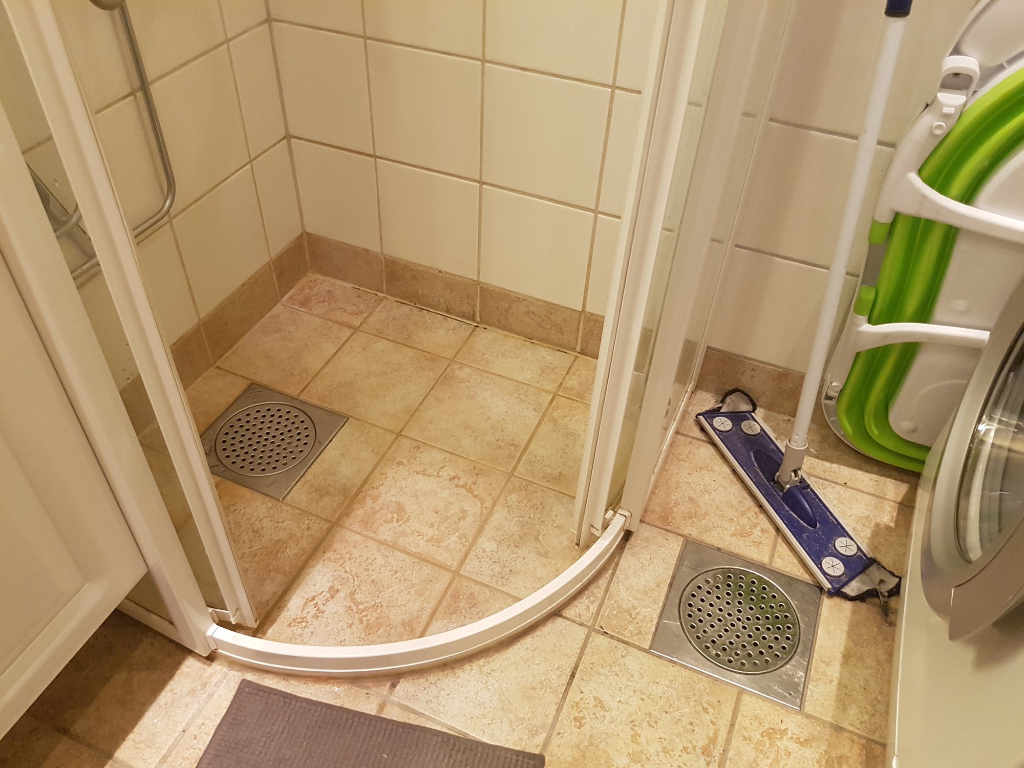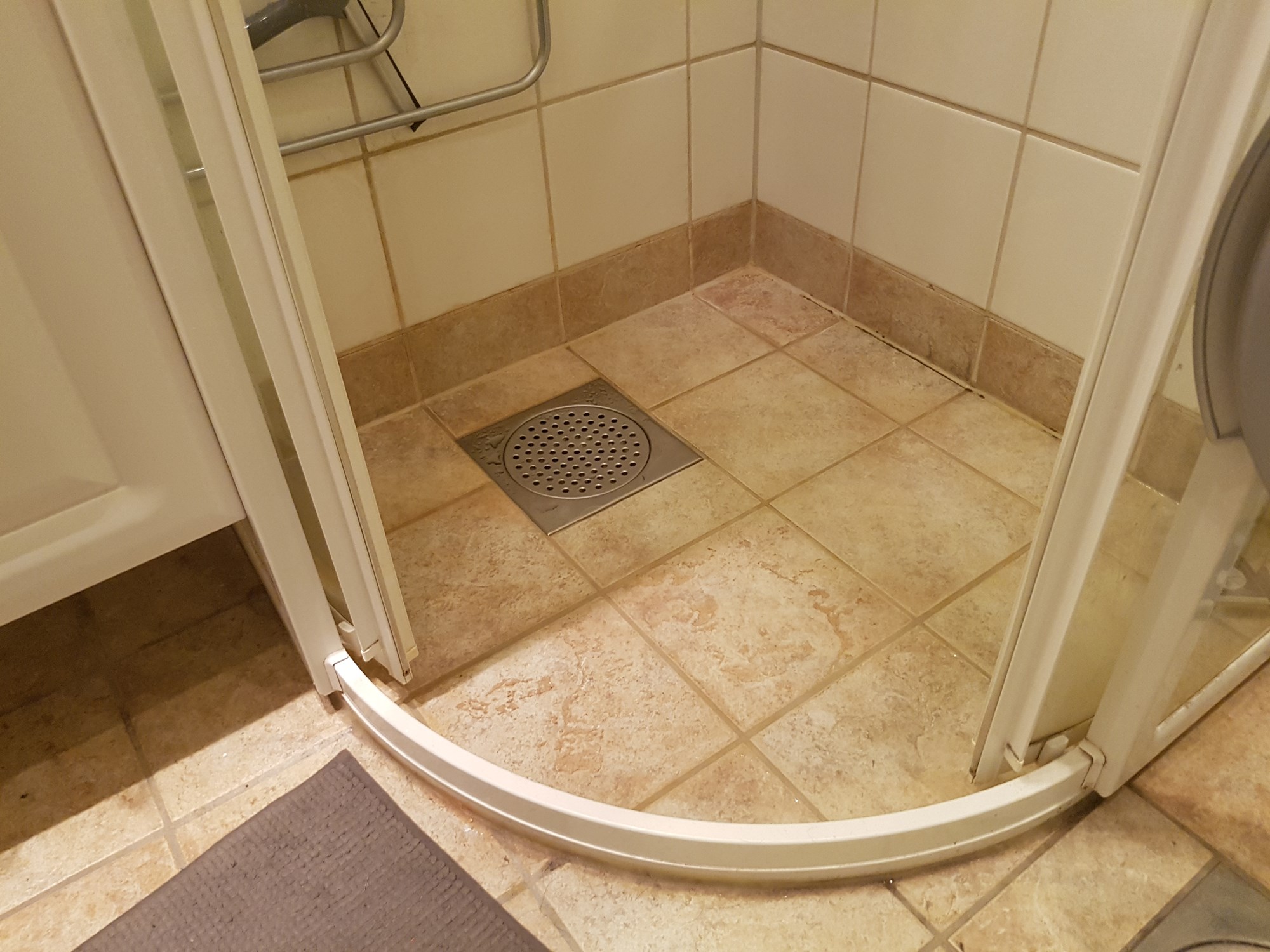 Jeg bor i en liten leilighet med et lite bad på under 4 kvm. Det ble pusset opp en gang på 2000-tallet så er ikke noe garanti gjeldende lenger. Det er satt opp et dusjhjørne rett på flisene, og de som pussa opp gjorde en dårlig jobb med hellinga i dusjhjørnet, så det blir liggende vann på gulvet etter jeg har dusja. Det har begynt å mugne litt bak silikonet langs veggen men ikke blitt noe verre siden jeg flyttet inn for 2 år siden. Hadde et annet prosjekt på gang og fikk da en rørlegger til å se på det. Han sa at mest sannsynlig var det ikke noe under flisene og det ville holde å fjerne silikonet og vaske bort muggen eller noe og legge på ny silikon.