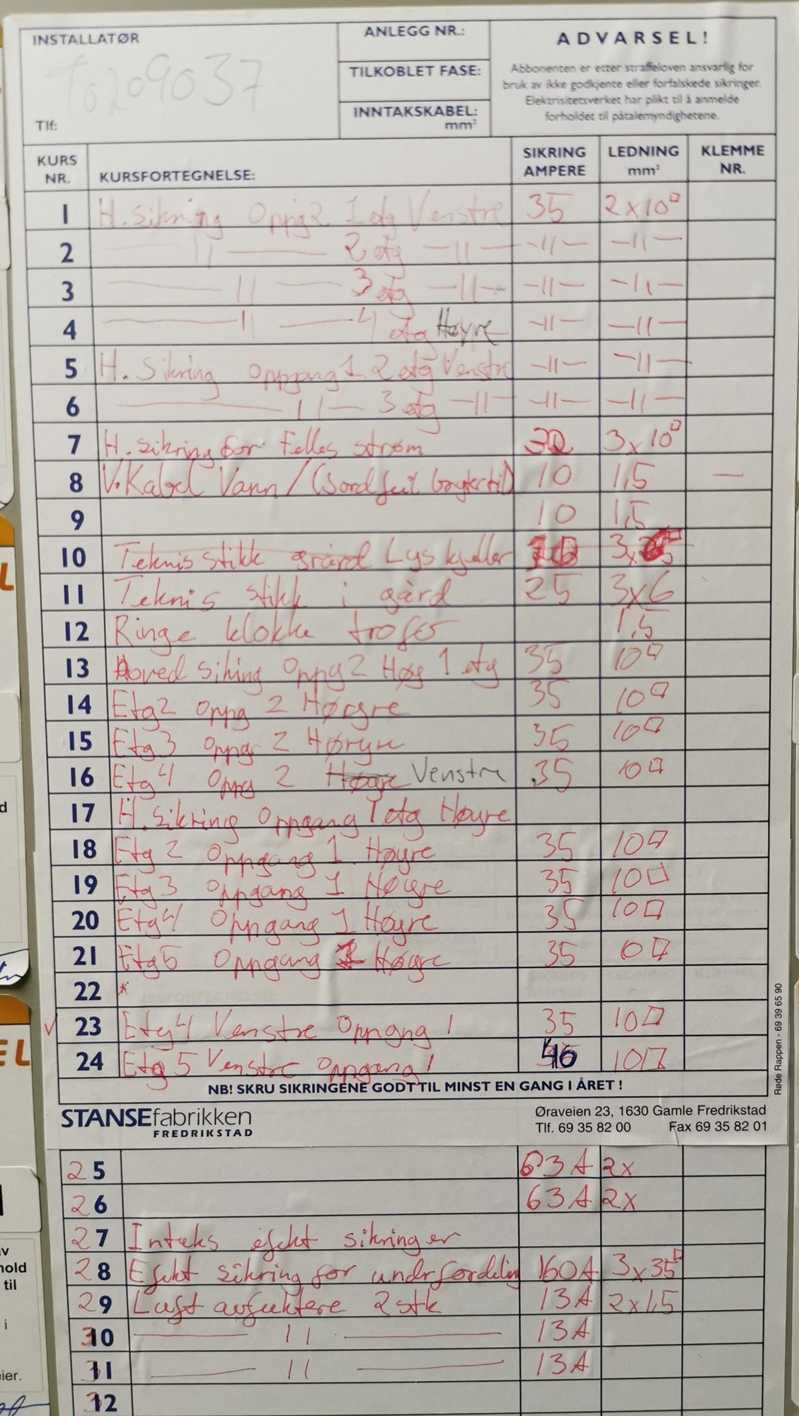 (Det hører med til min historie at elektrikeren som gjorde omleggingen spurte granskende: Du sier du har 35A hovedsikring? Ifølge mine papirer har du bare 25A! ... Det kan se ut som at forrige eier hadde funnet 25A for lite, og "fikset litt" på det. Men for det første var det nå på vei ut, og for det andre lå kabelen fra hovedsikring til fordelingen i sikringsskapet i et solid jernrør hele veien, så risikoen for brann ved eventuell ovebelastning og overoppheting hadde vært ganske beskjeden i de årene det hadde ligget sånn.)