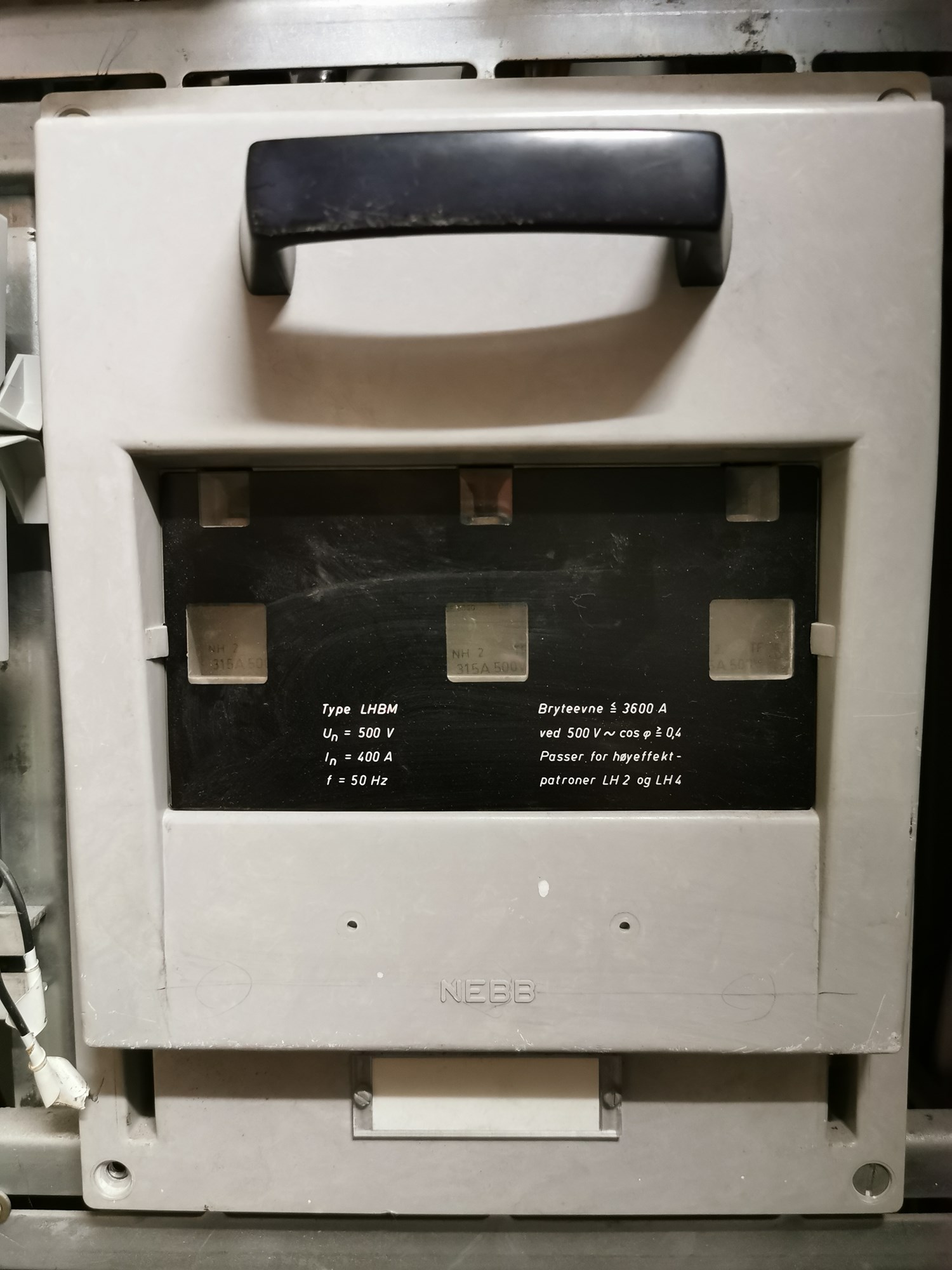 Bor i en bygård med 23 leiligheter + litt diverse strøm til fellesarealer. Hovedinntaket kommer inn gjennom denne hovedbryteren. Kan så vidt skimte 315A 500V på de tre displayene.