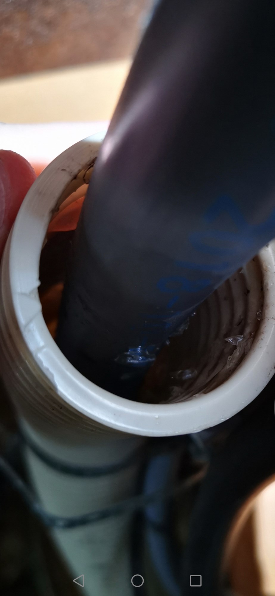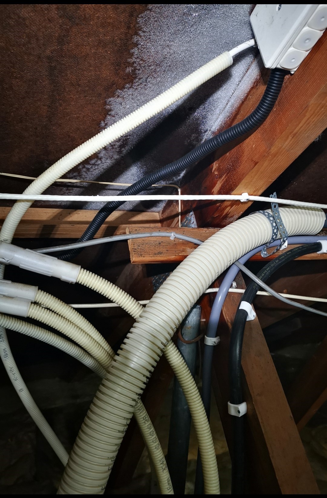 For et par uker siden ble jeg oppmerksom på vann som rant ut under sikringsskapet! Det kom vann inn fra oversiden (selvfølgelig) og det hadde dannet is/kondens på kaldloft med et senter som smeltet og rant ned da temperaturen steg etter forrige kuldeperiode. Se bilder. Det rant vann ned i det gamle inntaksrøret av alu, som stod vid åpent opp som en pipe (se bilde)! Det ble lagt altså nytt inntaksrør i 2018 og man lot det gamle stå tomt. Det har vært slik i over 5 år uten at jeg har merket noe fukt. Hadde også El-tilsyn her i august, som sjekket hele huset, inkl. alle skruer og koblinger i sikringsskapet uten noe bemerkning om spor etter fukt ell. Jeg vil anta det er først i år det har vært et større problem uten at jeg skjønner hvorfor. Det har vel vært mye skiftende temperaturer de senere år om jeg ikke husker feil.
