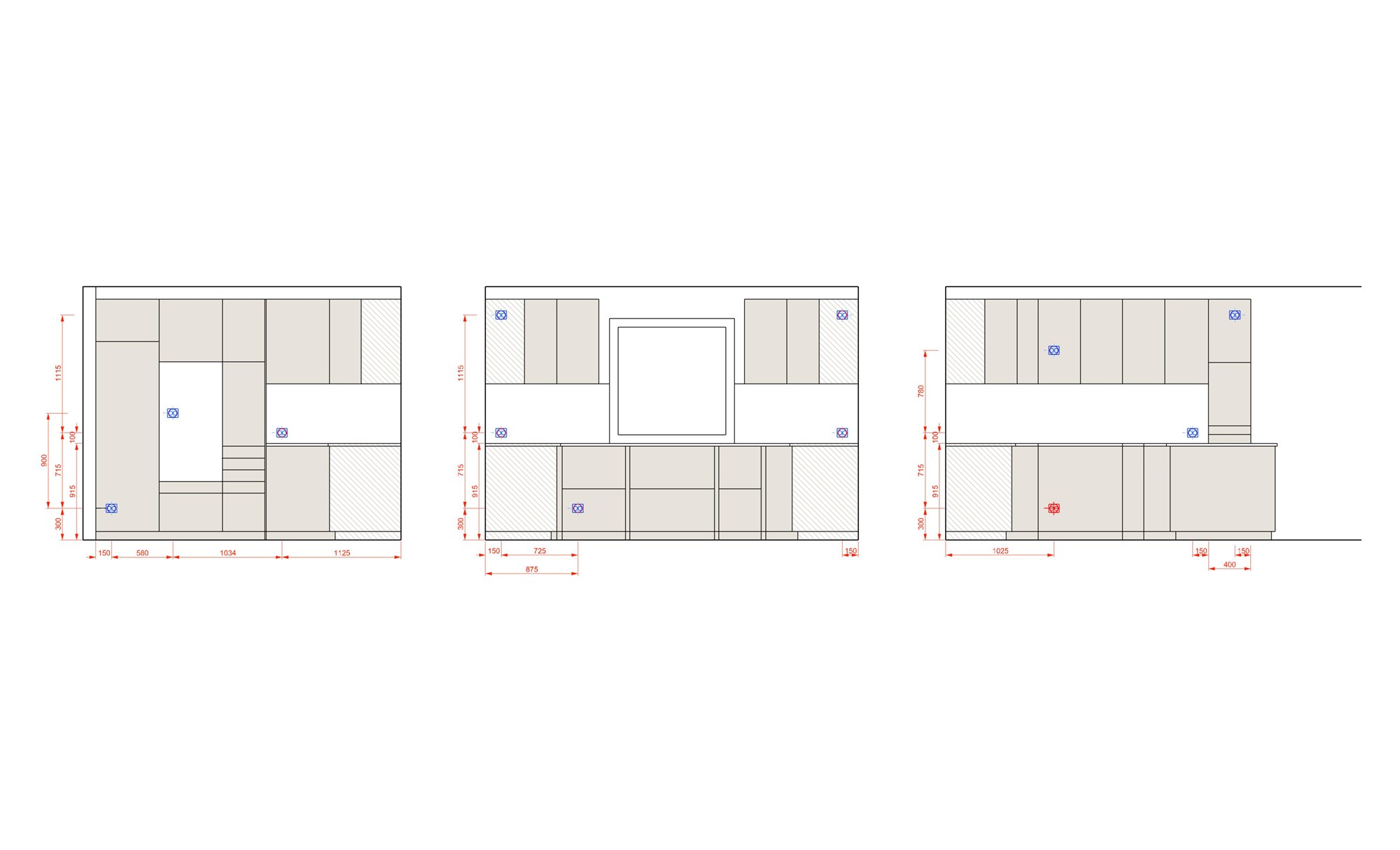 Resten er ganske rigid og bestemmes av innredningen, stikk til oppvaskmaskin skal være plassert i skap ved siden av, stikk til ventilator plasseres i kanalen, kjøleskap, mikro, komfyr, platetopp osv må plasseres der de står.