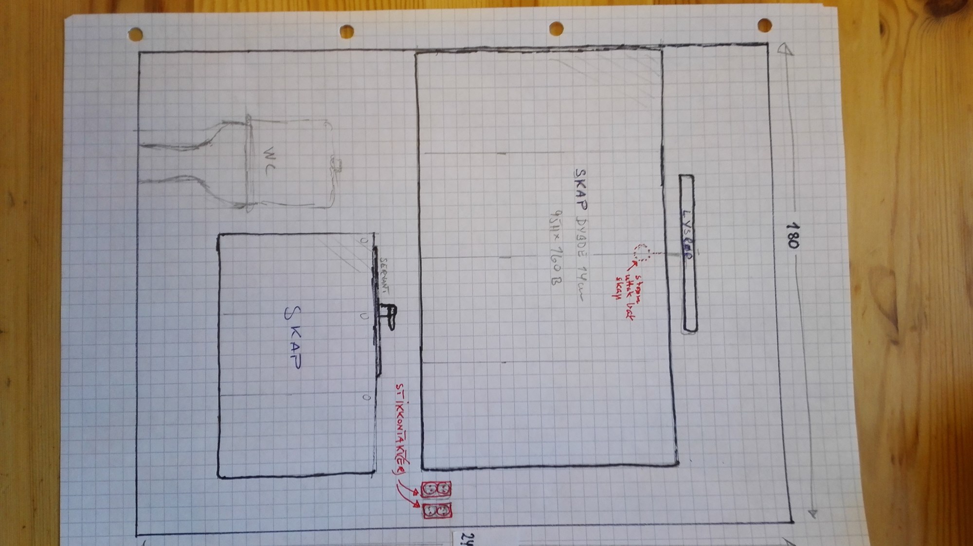 Som vist, er det et skap med innfelt servant og tilhørende vannarmatur. Over der er det et skap som stikker 14 cm ut fra veggen. Bak det skapet og høyt oppe på veggen er det et uttak for strøm. Uttaket er markert med en rød stipla sirkel. Fra det uttaket er det ført en kabel opp til lysrøret, som er plassert ca 2 meter over gulvhøyde.