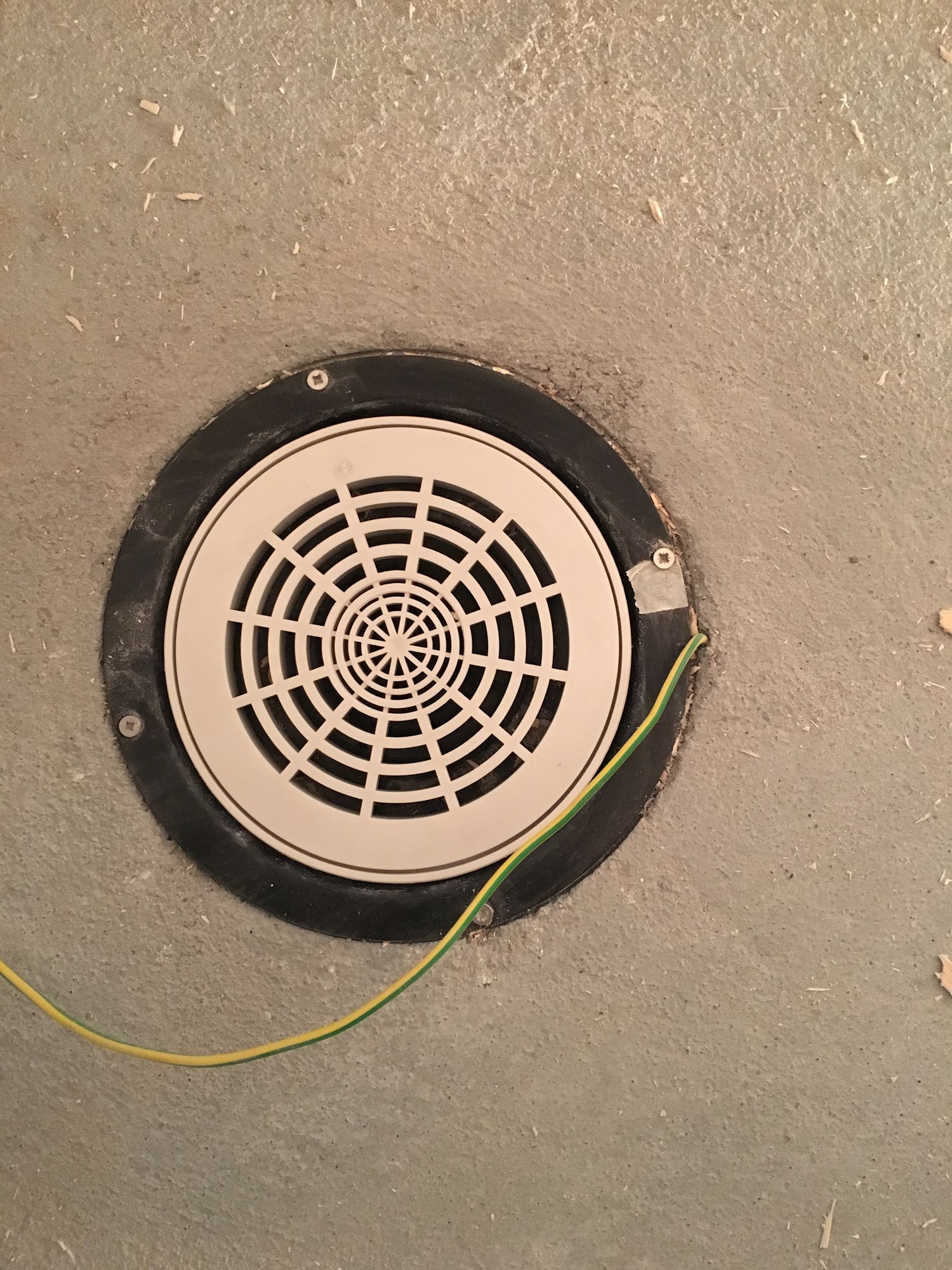 Det ser ut som om det er pili-sluk? Om det er varianten med tilkobling til jord så skulle jordlederen ligget i støpen. Du kan vel frese et spor til jordlederen om du er forsiktig og fylle med feks heydi express. Alternativet er at jordlederen fjernes fra sluket og kobles til selve slukristen etter at membranen er lagt. Jordlederen legges da i flislimet.