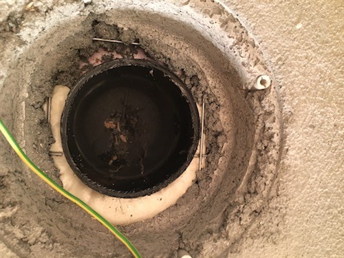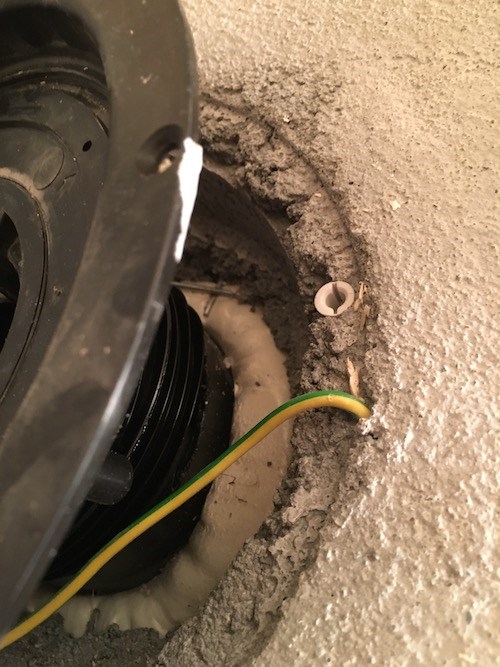 Det første bildet viser den feilinnstøpte jordlederen. Dersom jeg legger den ned under sluket vil den ligge i klem mellom sluk og gulv. Det vil altså være en dårlig løsning. Men hvis dere ser på bilde nr. 2 kan en skimte litt av armeringsnettet. Da bør det vel være mulig å bare dra en jordleder fra armeringsnettet til nytt sluk med jordingspunkt?