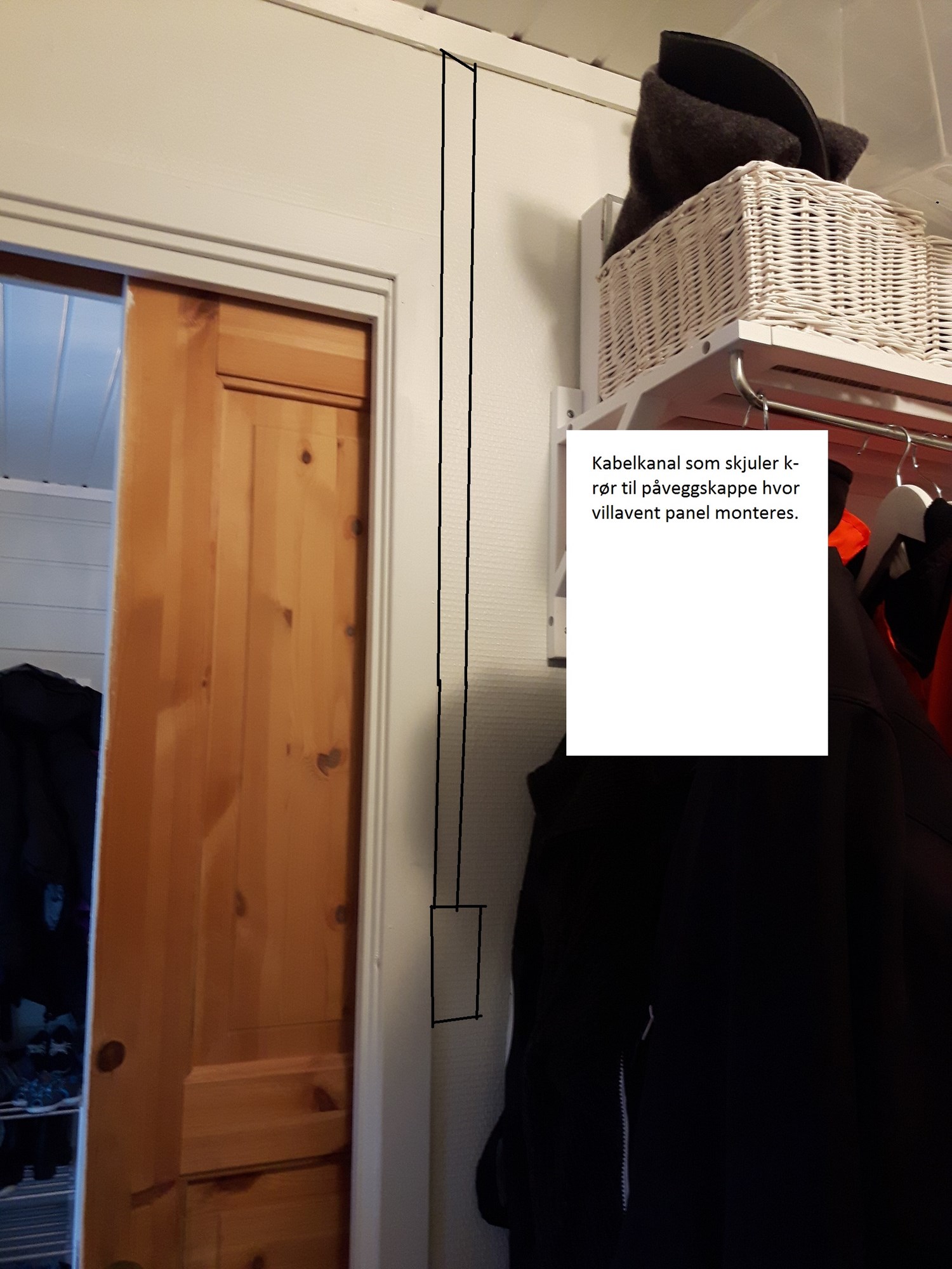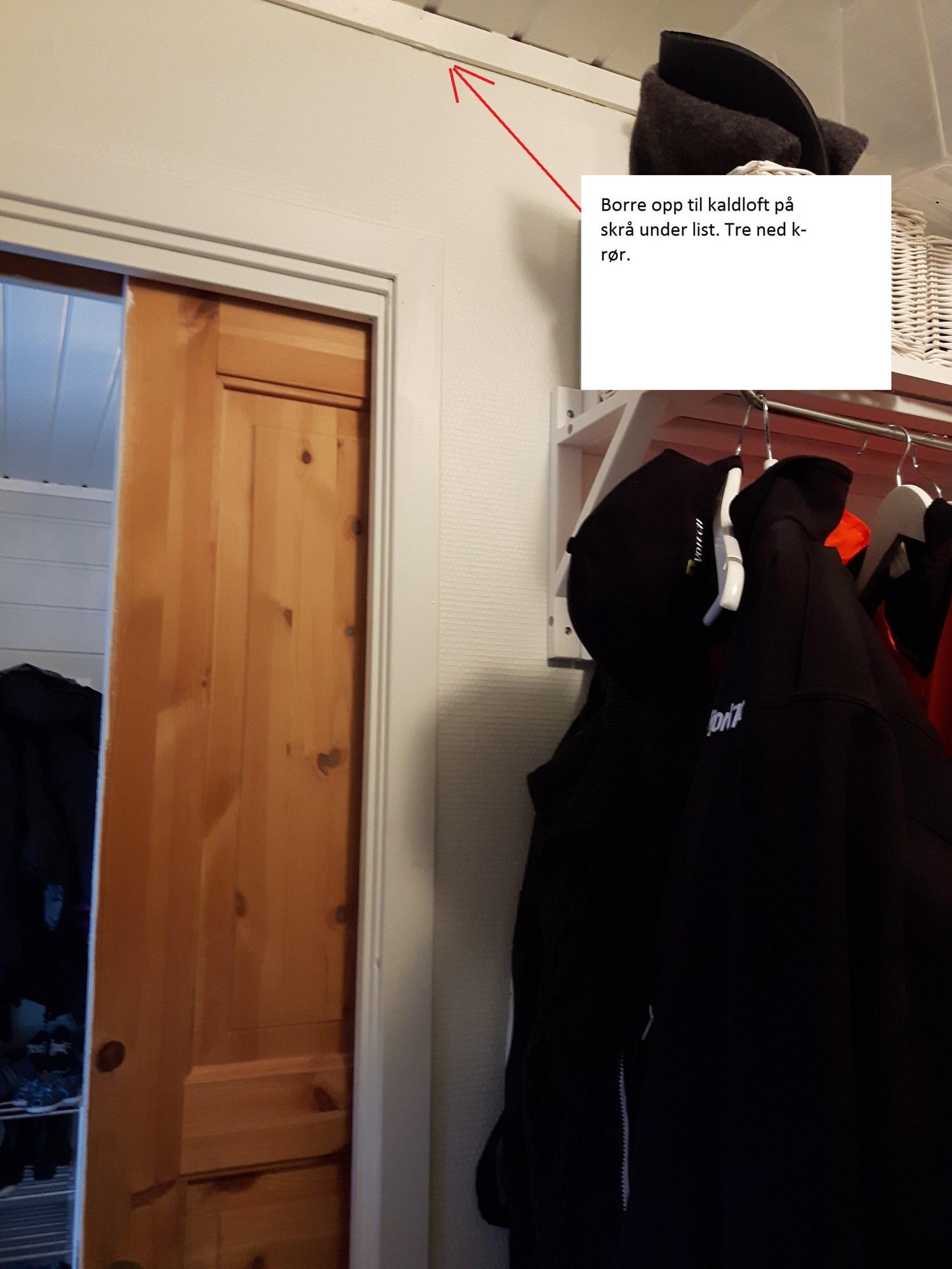 Vaskerommet er mye nærmere ventilasjosanlegget og jeg vurderer å flytte villaventpanelet dit. Tenker da å kappe k-røret på kaldloftet over stuen og tre det ned på vaskerommet. Og legge det utenpåvegg til en påveggskappe og skjule k-røret med en kabelkanal. Se bilder under. Det er 7 ledere, så tror ikke det hadde blitt så pent å gjøre det med PR.
