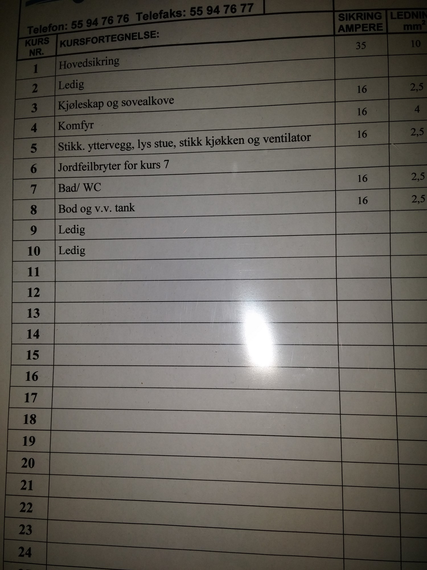Kursfortegnelsen som du har tatt bilde av i sikringsskapet ser ut til å være oppgradert. Vil du ta bilde av selve sikringsskapet, slik at det er mulig å se jordfeilbryteren som er installert i skapet. Har kursfortegnelsen en firmalogo, eller er det kun oppgitt telefonnummer og et firmanavn?