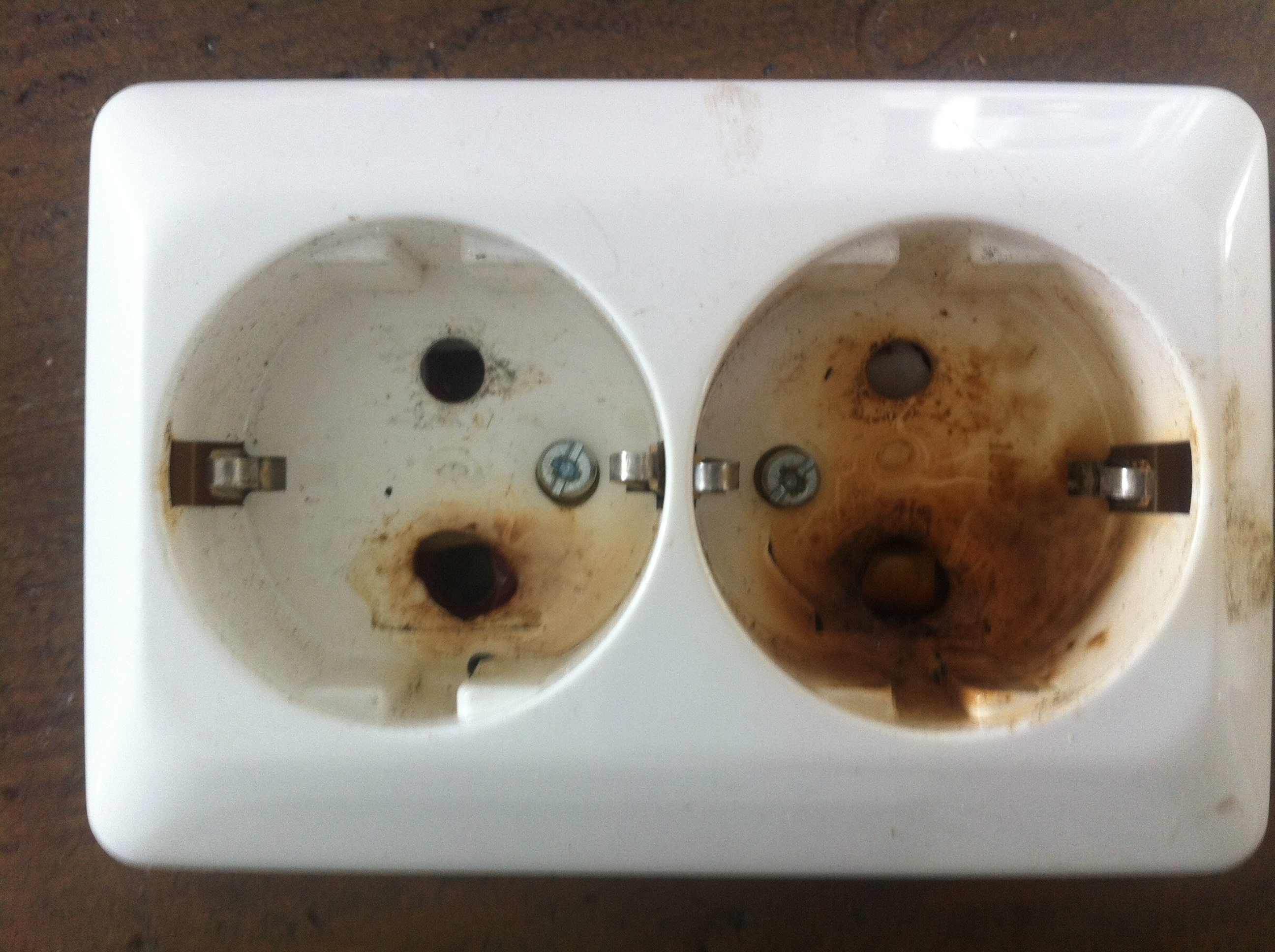 Utifra hva jeg kan se på bildet så virker det som de fjærene som skal holde rundt pinnene til støpselet på de 2 nederste og den øverste til høyre virker litt slappe,noe som igjen kan føre til varmegang,så der har du nok årsaken.