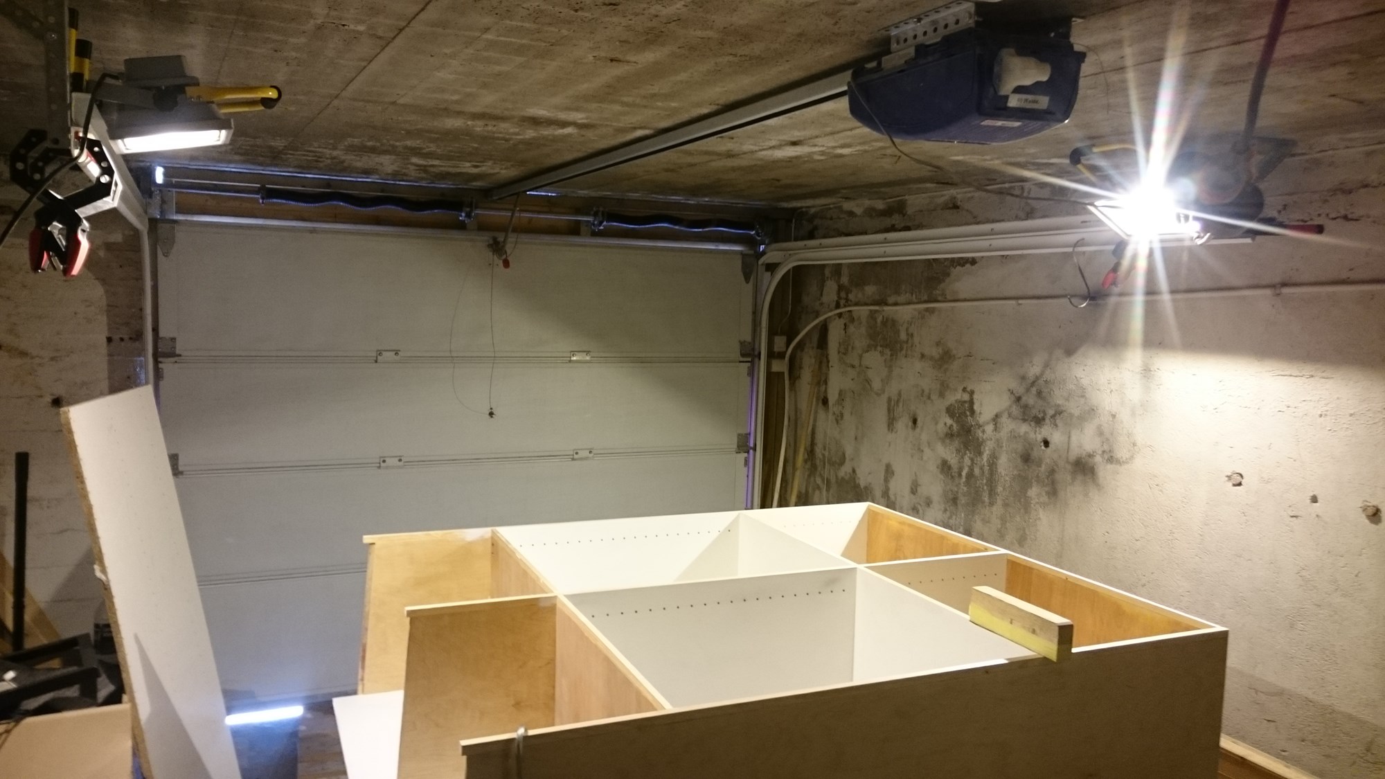 Det er forresten ikke noe strømførende i nærheten av dette i det hele tatt. Garasjeportåpneren og arbeidslampene er koblet til via skjøteledninger inntil videre. Disse var som sagt frakoblet under målingene.