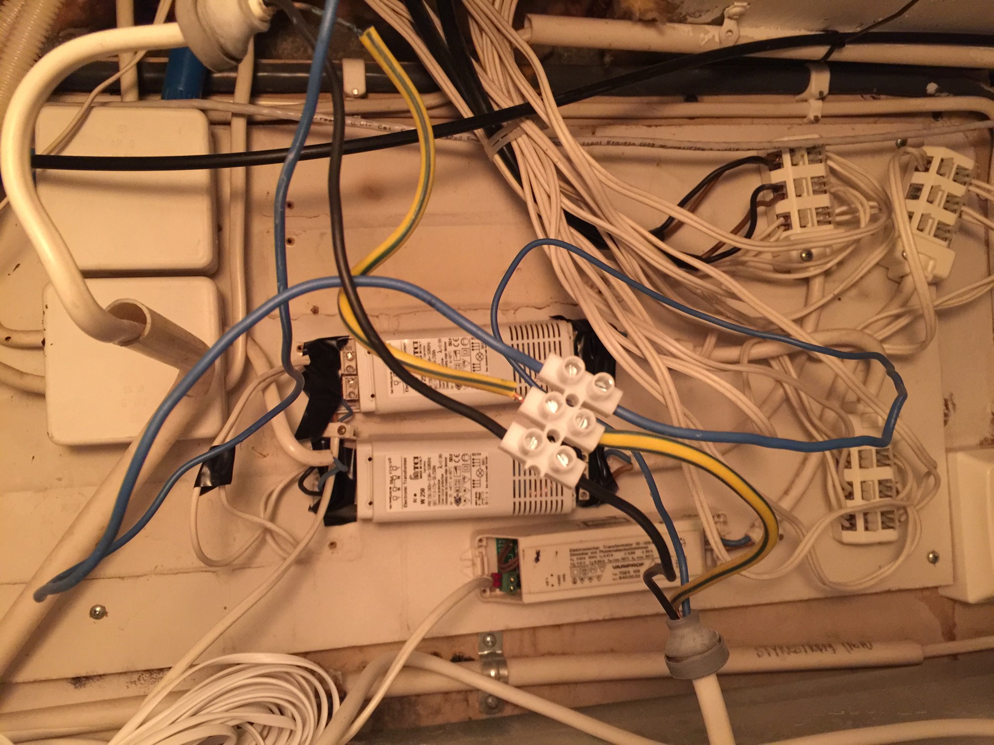 Det kommer tre ledninger ut av hygrostaten (blå, svart og gul/grønn, antar at den siste er jord). Tilsvarende ledninger går inn til luftfukteren. Har forsøkt å koble disse sammen direkte med samme farge (se bilde), men luftfukteren er fremdeles like død.