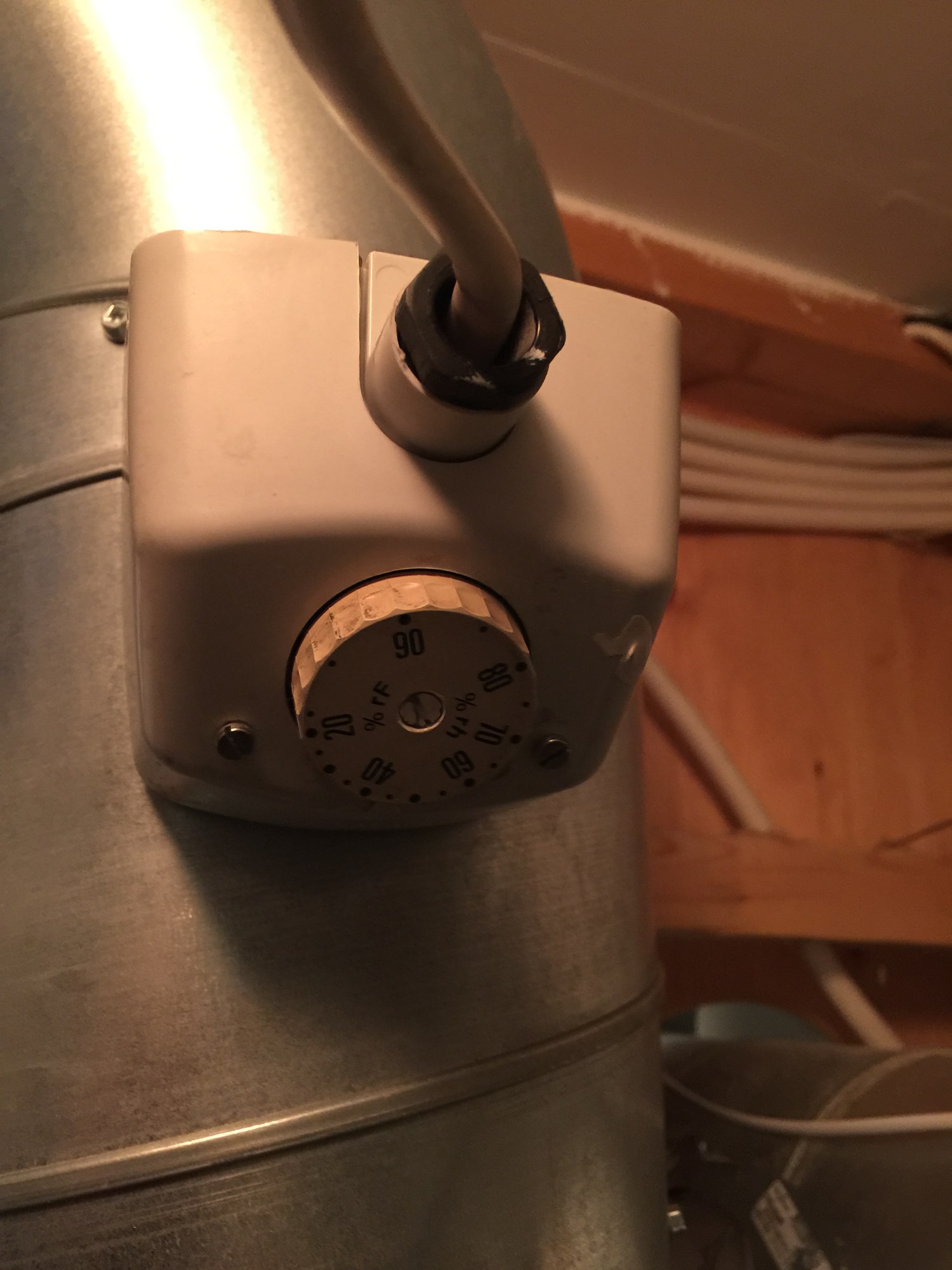 Litt tilleggsinfo: spenning mellom blå kabel og jord faller til null om hygrostaten settes lavt (det høres et klikk som tyder påvist den skrus av rundt 35% eller noe sånt).
