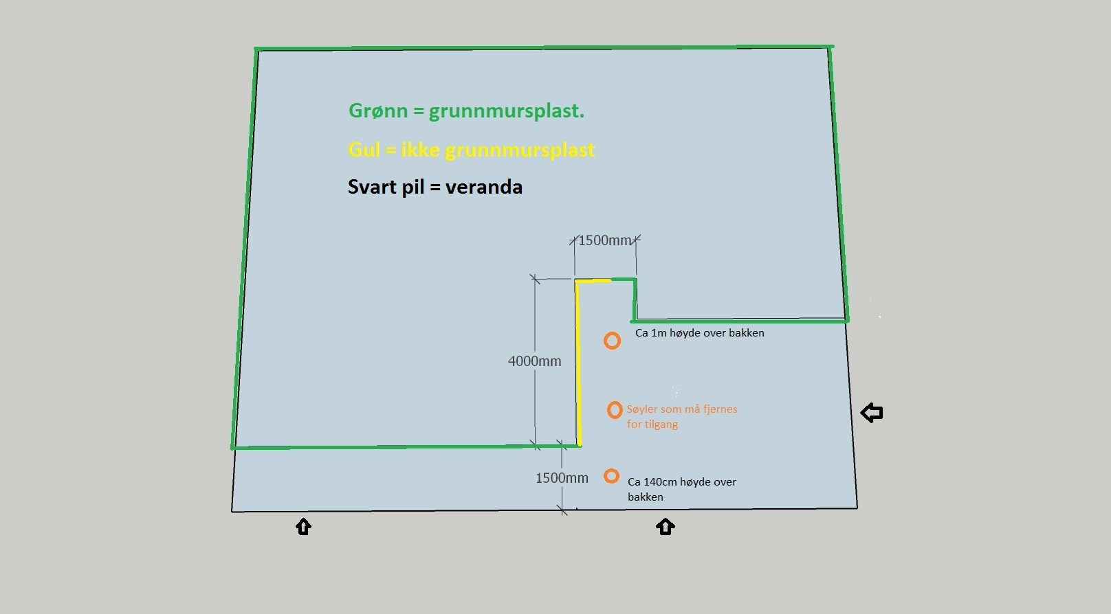 Se vedlagte skisse. Har noen tips om en maskin som kan klare å grave ut det meste av massene uten at jeg trenger å rive verandaen? De tre søylene merket orange må fjernes, men verandaen er mer enn godt nok fundamentert til at den skal klare å holde vekta oppe mens disse tre er fjernet.
