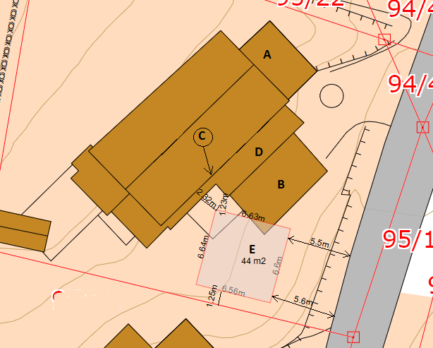 Garasjen slik jeg tenker vil jeg plassere mellom huset og veien, nedgravd i terrenget slik at jeg lager en innkjørsel fra veien, 5 meter lang praktisk talt flat og inn i front på garasjen. 5 meter lang oppkjørsel er kommunens krav og dessuten slik jeg ville hatt det uansett for å få mulighet til å sette biler foran garasjeportene uten at de stikker ut i veien. Kommunen har også normale krav til helling på innkjørsel så når den er så kort som 5 meter så må den bli praktisk talt helt flat.