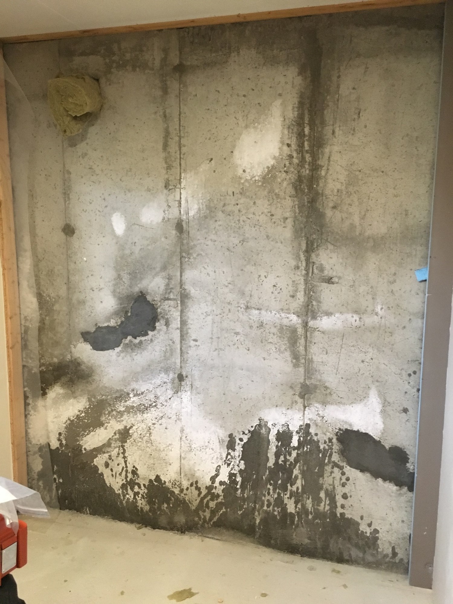 Veggen inn mot nytt bad. 50mm Tettiplate som er punktlimt mot betongveggen.