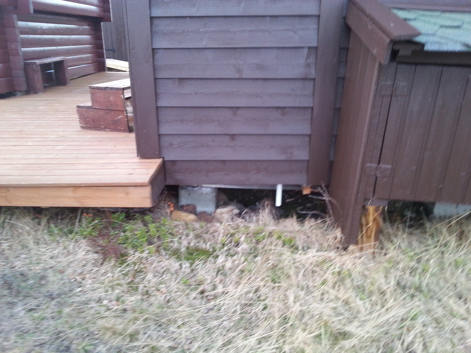 I vinter oppstod et problem med telehiv på hytta vår, der resultatet ble at vi ikke fikk lukket ytterdøren. Jeg har kommet frem til at pålen/søylen avbildet under hushjørnet er årsaken. Problemet forsvant da telen ble borte. Etter å ha fundert litt har jeg planlagt følgende; jeg må grave frem søylen ( ned og rundt), og området til høyre for den på bildet, der vann fra utslagsvasken vår renner ut (via det hvite røret). Jeg må videre grave en kanal ut fra veggen og ned til myra nedenfor, for deretter å legge dreneringsmasse med dreneringsrør fra området under hytta og ut ( med filt under og langs kantene), for om mulig å motvirke at vann legger seg rundt søylen. Jeg vet ikke hvor dypt jeg kommer med dette, men jeg er engstelig for at et slikt dreneringsanlegg vil fryse om vinteren. Jeg har ingen erfaring med slikt arbeid, og lurer på følgende: