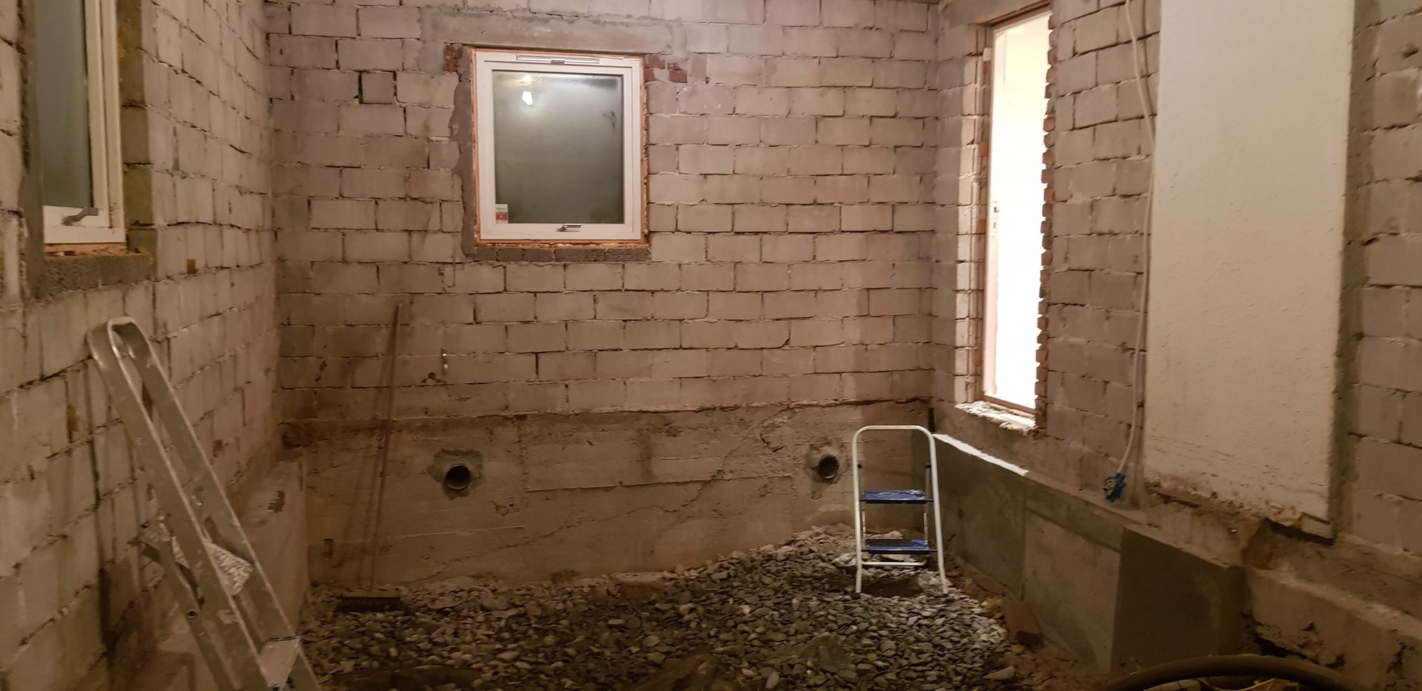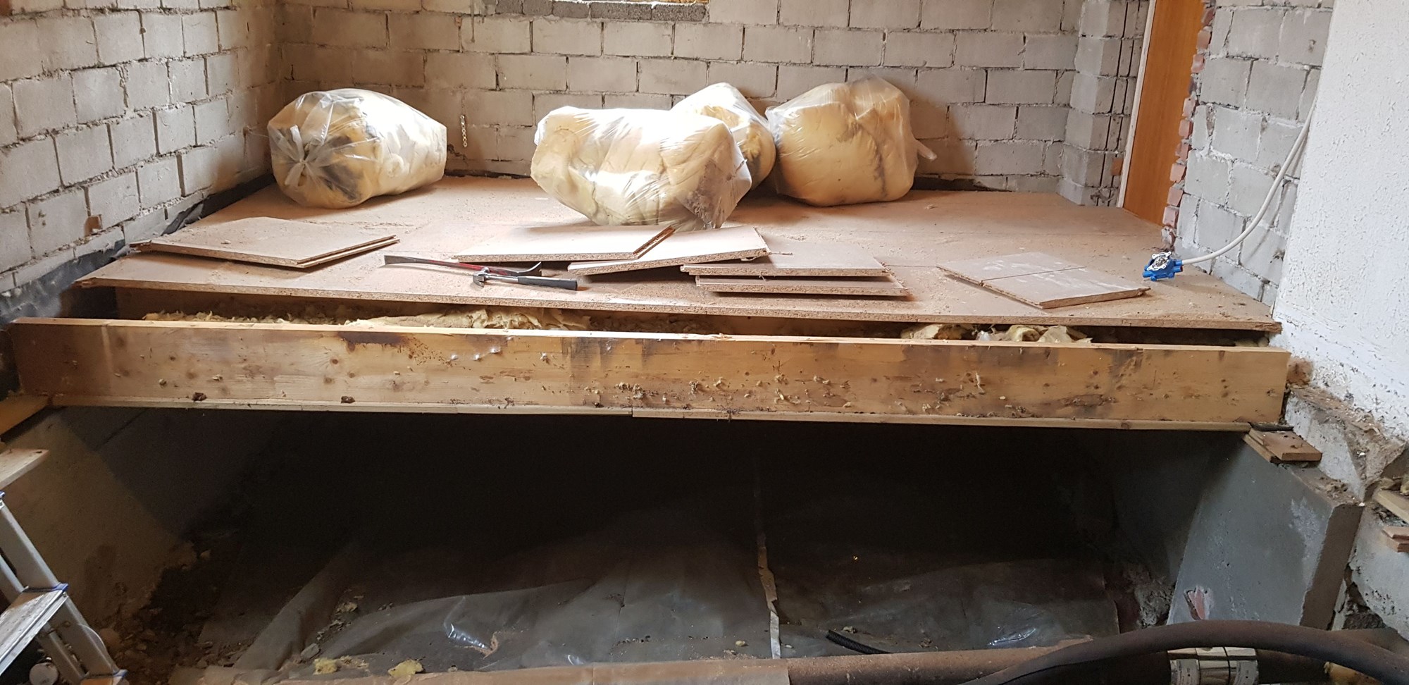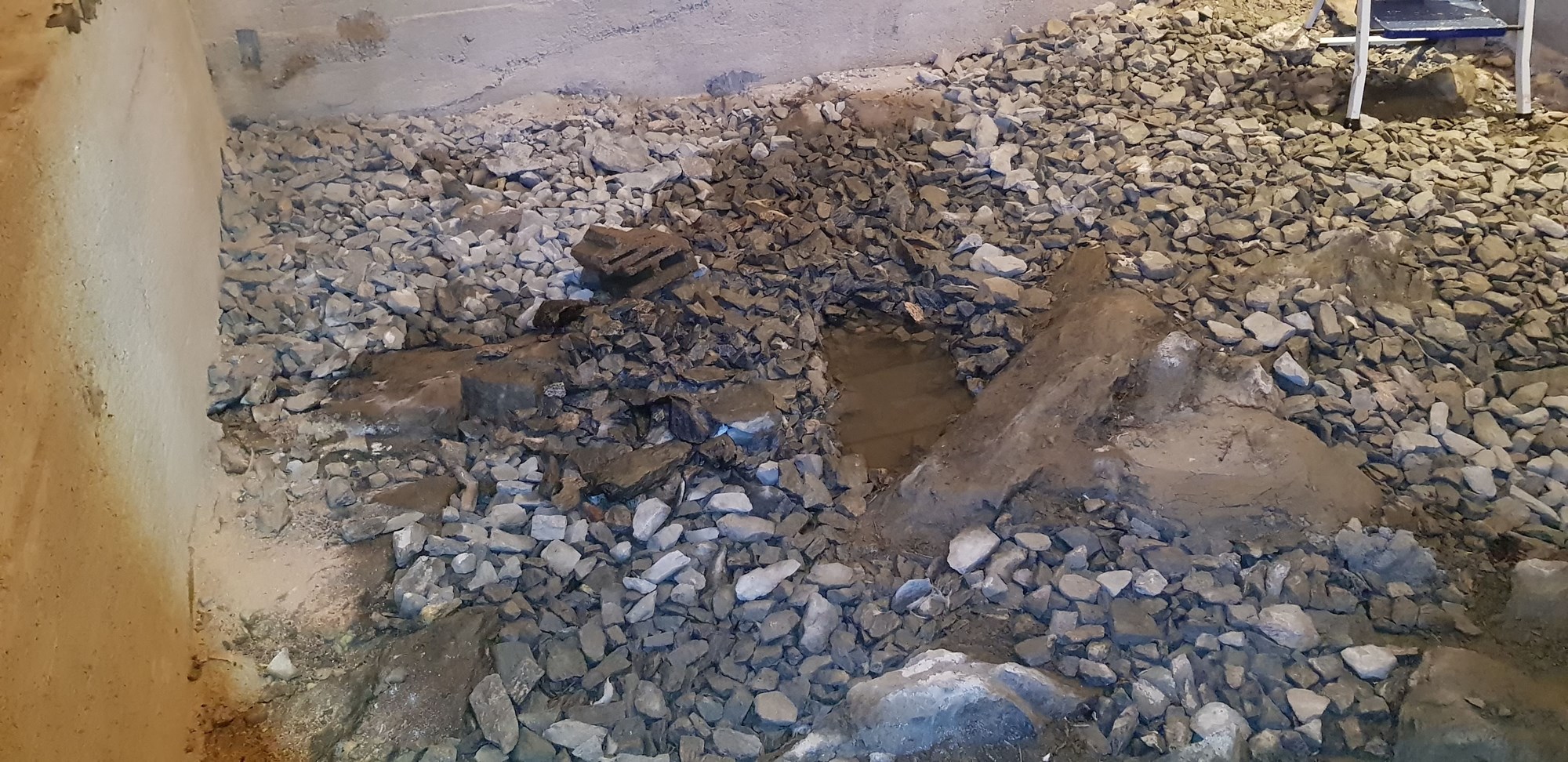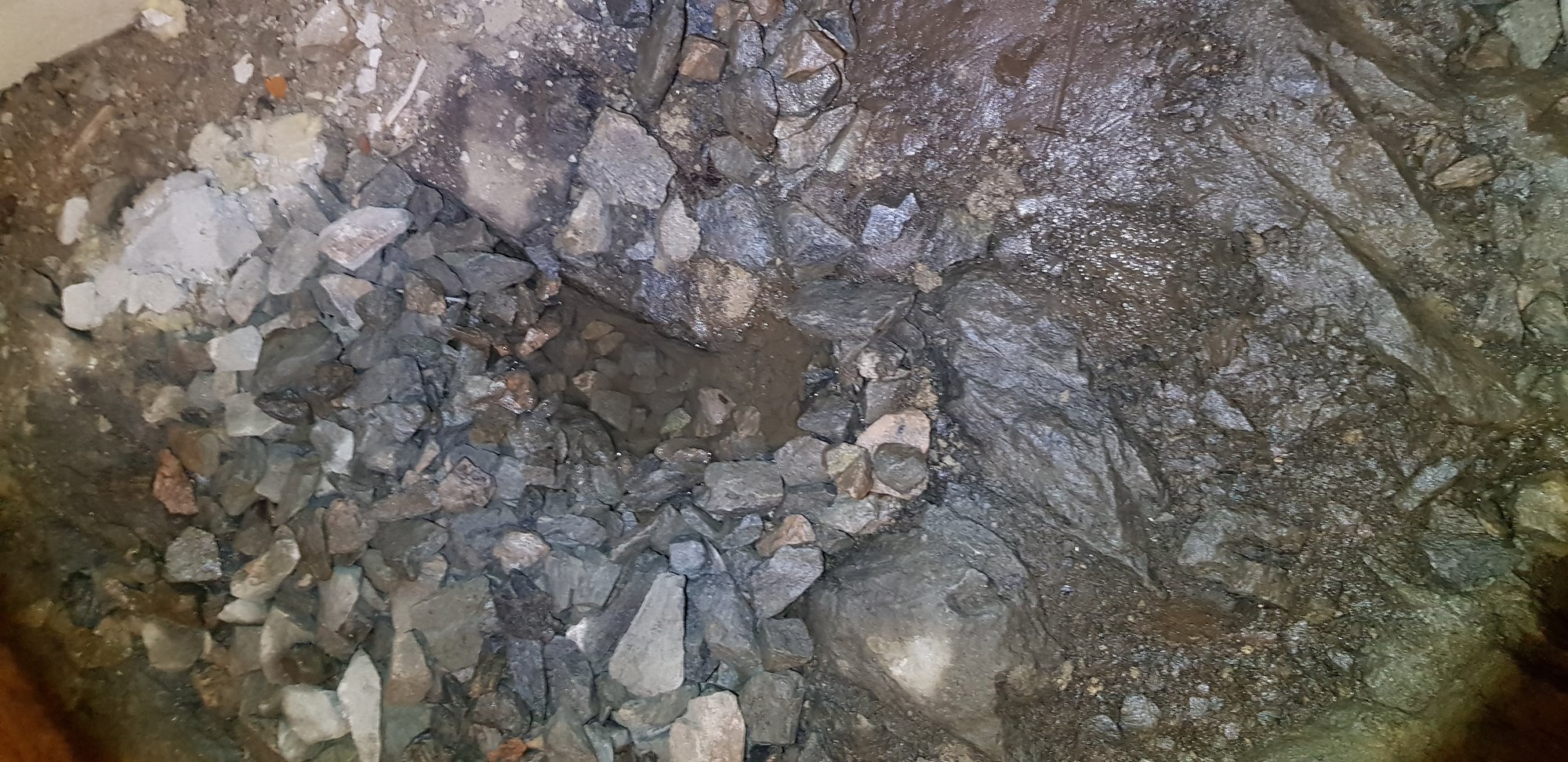 Fra før var pukk og berg dekket med en hullete og løs fuktsperre. Asfaltpappen på bunn av gulvbjeler var noe hvit og. Kunne se ut som sopp.