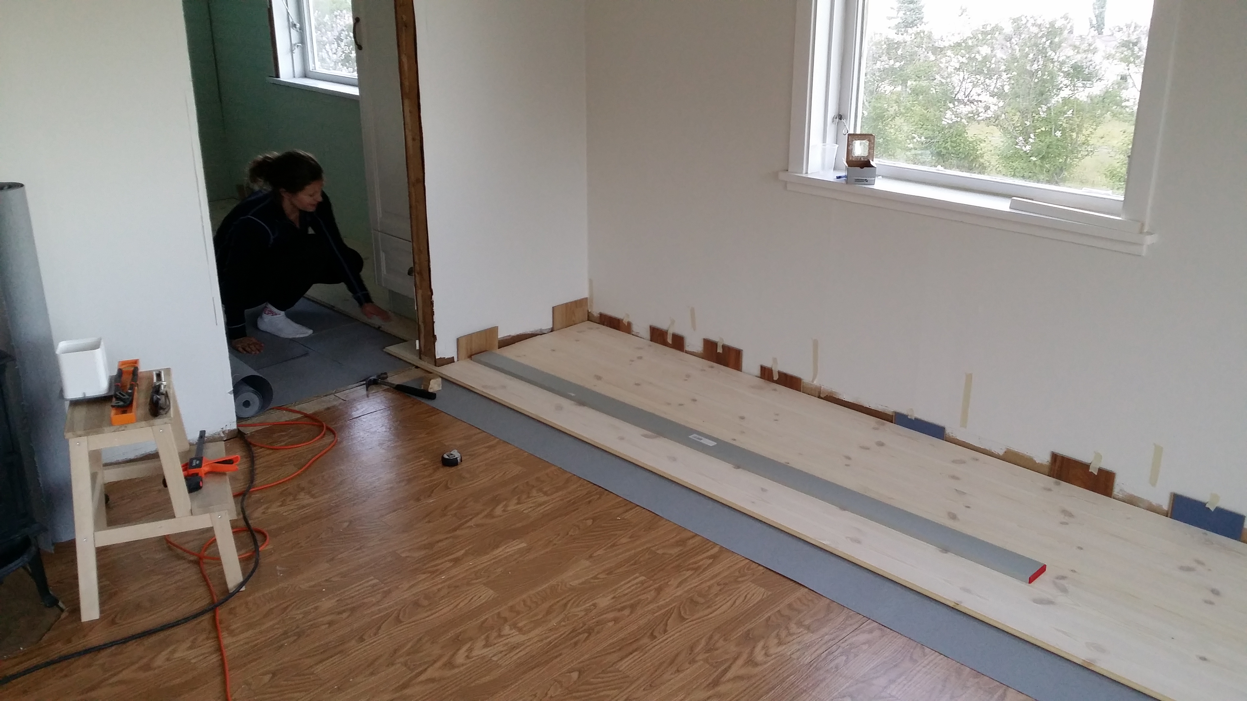 Da ble det lagt fire-fem rader med bord i går. Brukte ekstra god tid med rettholt og klosser mot vegg og la fra vindusveggen (med ett vindu) på stua slik at bordene går i flukt med der solen vil skinne inn. Det som ble den store dråpen som vippet retningen dit var da vi prøvela et par bord i hver retning. Når bordene peker mot vegge med fire vinduer og verandadør fikk vi et helt annet skinn i bordene og de fremsto vesentlig lysere og hvitere.