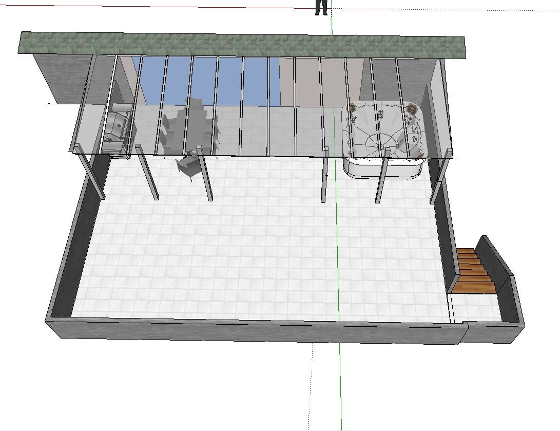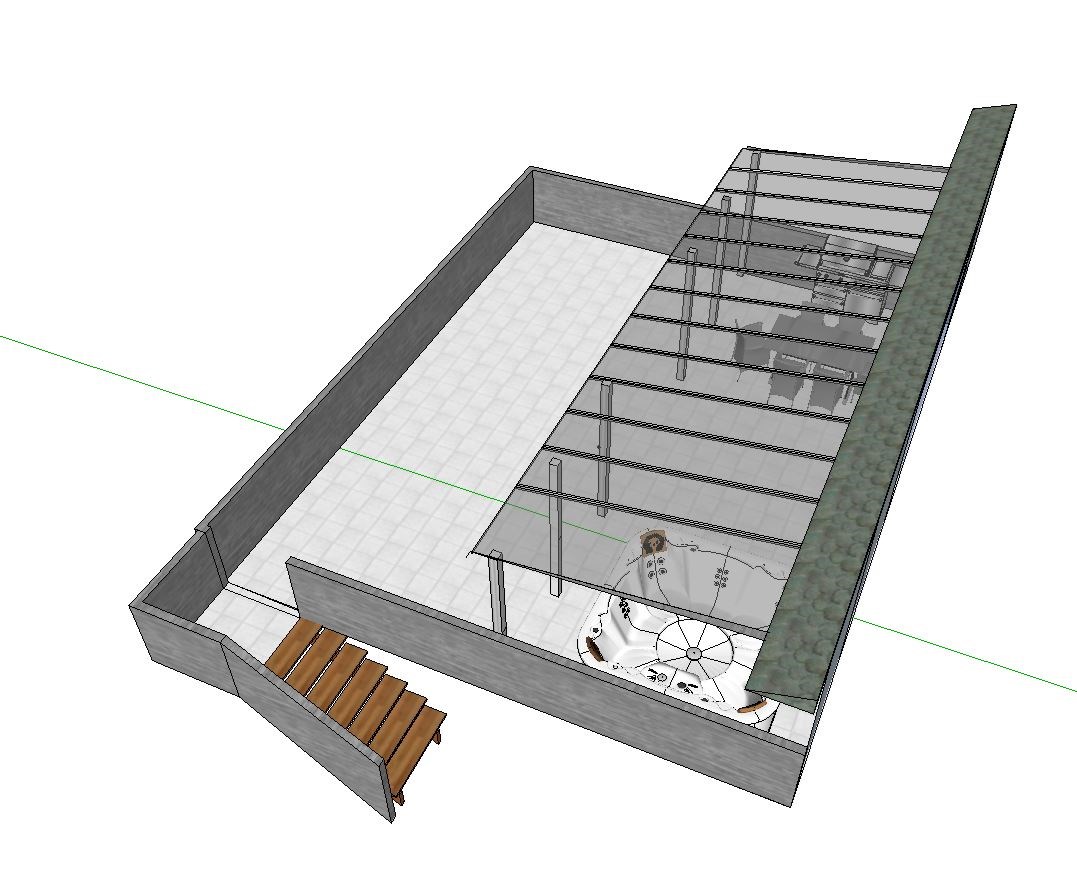 på ytterside av Jacuzzi tenker jeg å bygge levegg som følger tak med vinduer, samme ved grill der vi tenker å bygge utekjøkken.