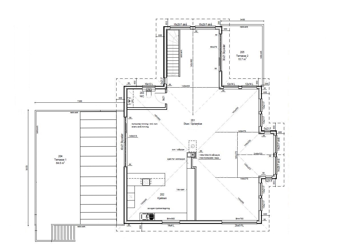 Rekkverk er tett med kledning på begge sider hvor vi legger 48x148 på topp med blikk over slik at vi kan ha skjulte LED-striper for stemningbelysning.