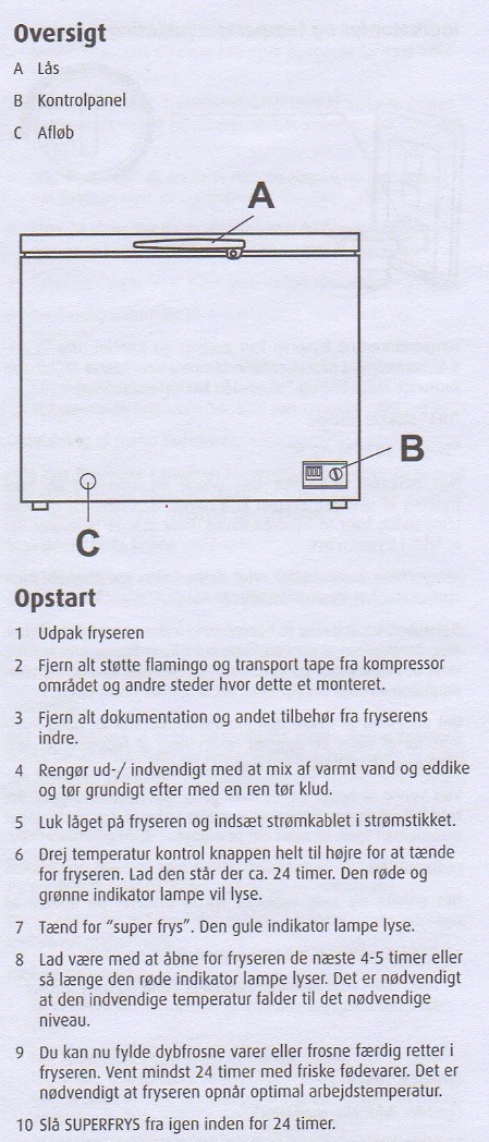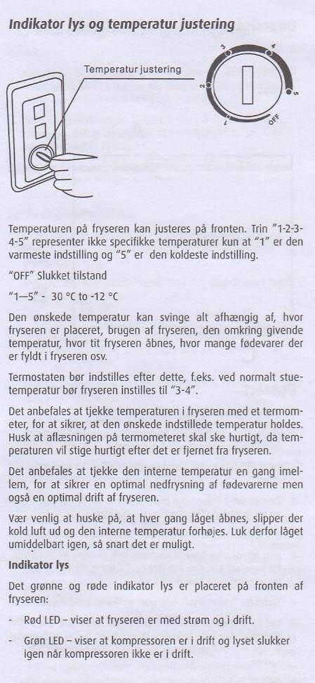 Har kjøpt ny fryseboks, men bruksanvisningen er helt uforståelig. Jeg ventet to timer etter frakt før jeg satte i gang. Rød LED lampe for strøm og grønn LED lampe for kompressor i drift. Satte den på "off" før jeg puttet i stikkontakten. Maksimumstemperaturen og minimumstemperaturen i posisjon 1-5. "Tidligst fill 4 timer etter oppstart", men ingenting om innstillingen ved oppstart. Bare at man ikke skal skru for mye på temperaturen fordi fryseboksen skal finne temperaturen selv.