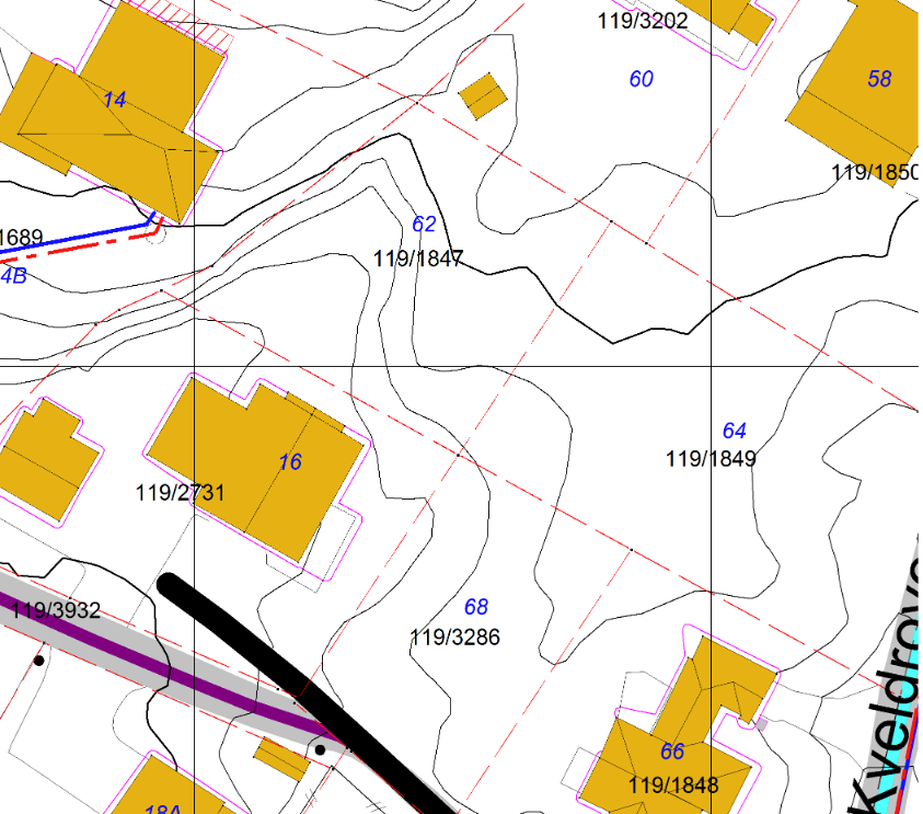 Vi eier gnr 119 bnr 1847 og 1849. Den grå der er den regulete innkjøringen fra 1993.