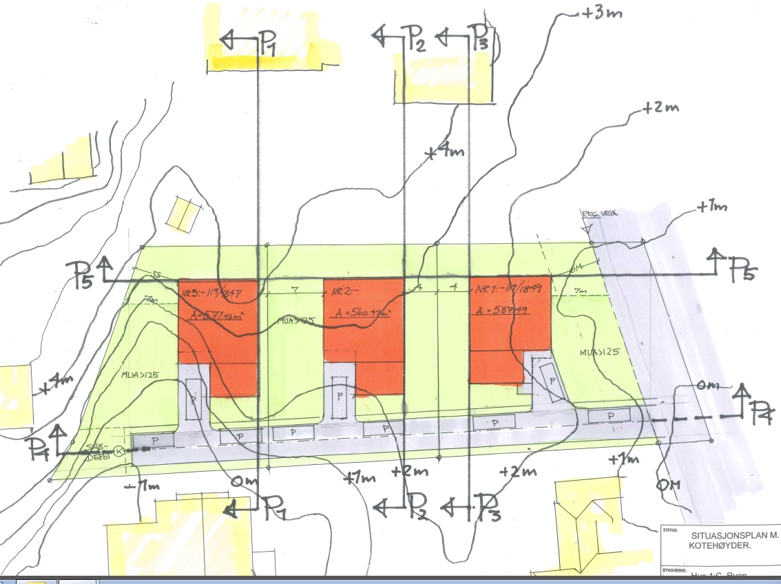 Vi er 3 familier som skal bygge 3 boliger på en tom ti vår kjære by. Tomten er stor den, på 1,8 mål. Men utfordringer med byggelinjer, snørydding etc så har arktitekten vår tegnet våre tre boliger med en adkomst sør på tomten vår, - og det er regulert inn en adkomstvei til tomten vår fra 1993 nord på tomten. Adkomsten er regulert inn i samme gate, men da 17 mter lengre opp på tomten.
