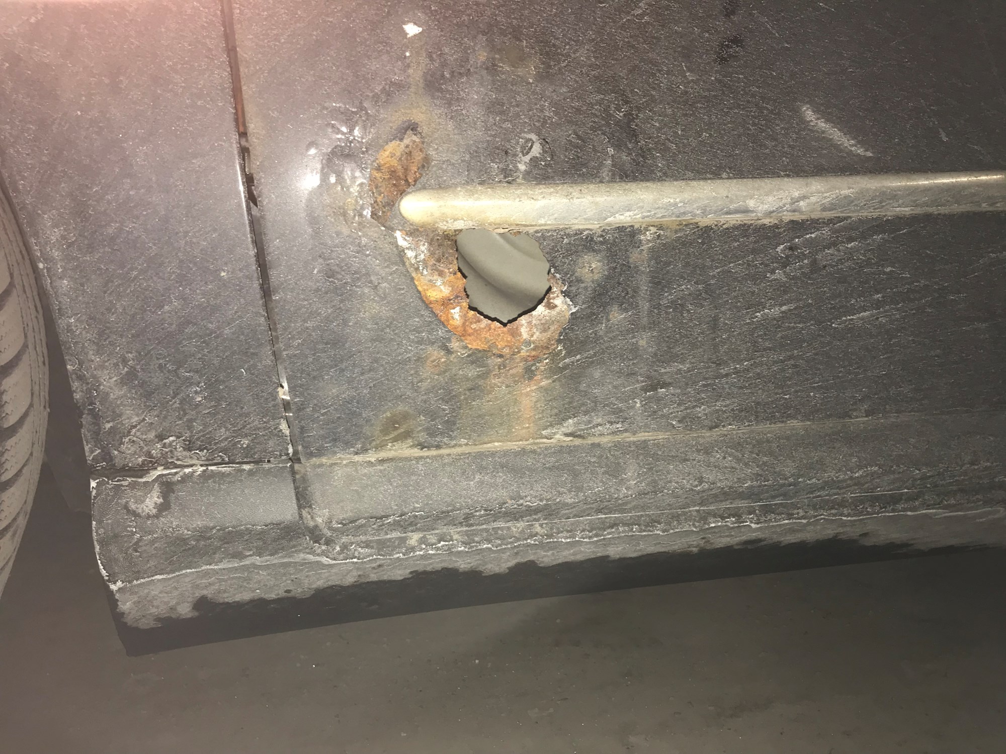 Bilen går helt fint, det er kun dette sjenerende hullet i førerdøra. Har forstått at jeg må fjerne all rust og kappe grovt rundt. Men da vil det bli et ganske stort hull, tipper det blir så stort at man kan få en håndball igjennom. Hvordan tette? Har lest om noen som legger netting i bakkant og sparkler over, men er vel vanskelig å sparkle et så stort hull? Noen ideer??