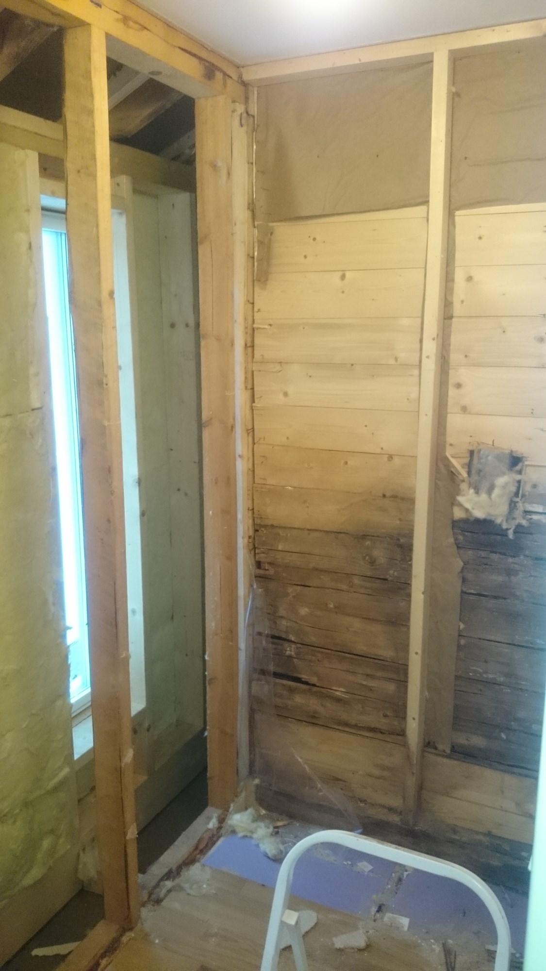 Etter en del research og planlegging begynte jeg å rive i dag. Veggen mellom walk-in er revet og veggen mellom walk-in og dusj er påbegynt. Som dere ser på bildene så er nederste del pil råtten. Den gamle ytterveggen er også tatt og det er bare stenderverket som står igjen der.