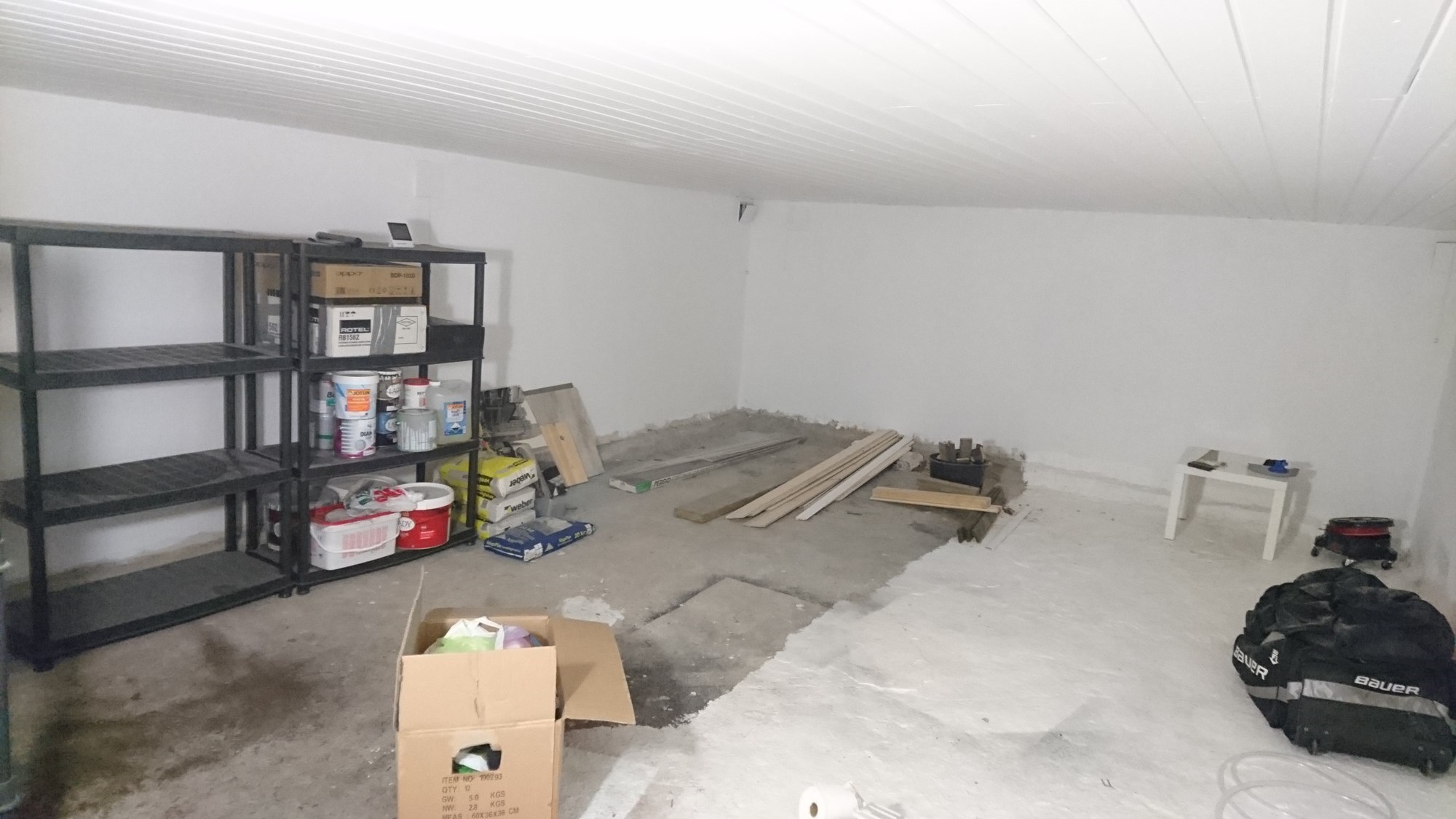 Vi holder på fikse opp et kjellerrom i underetasjen. Avrette kjellergulvet og få inn mange reoler for oppbevaring osv. Pr idag er det 5 luker her derav 3 står åpne. (30kvm)