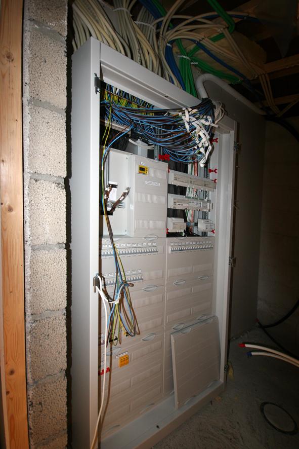 Takker! I kablene går det 1600m med Cat6 kabel, 800m med EIB/KNX kabel, 400m høytalerkabel, 120m med signalkabel for Lyd/bilde og 4200m med 3G2,5 ( en del 4G2,5 og noe 5G2,5 ). Så det ble noen kroner i rør og kabler :-/
