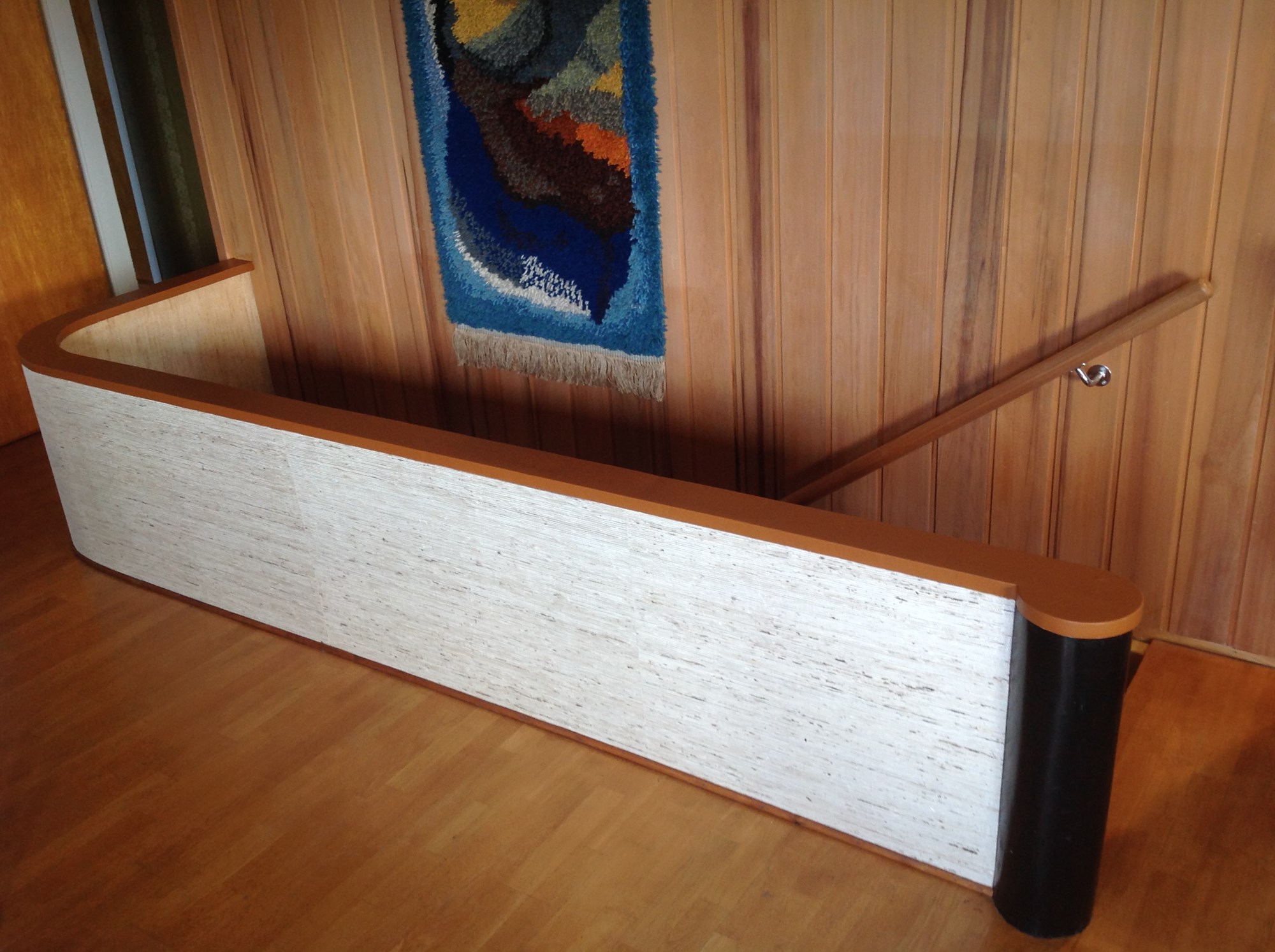 Rekkverket rundt trappehuset fra sokkel til første etasje er solid og pent utformet, men altfor lavt. Det er kun 60cm høyt. Jeg har mang en gang tenkt at vi må gjøre noe med dette her, men manglet ideer. En tanke jeg har hatt har vært å feste to parallelle håndløpere på toppen av nåværende rekkverk, men jeg sliter med å finne beslag (feste, holder) til dette, må nok få spesiallaget beslag eventuelt. En slik løsning vil antagelig være ganske passende i vårt hus, både ganske 1950 talls og kanskje til og med litt funkisinspirert.